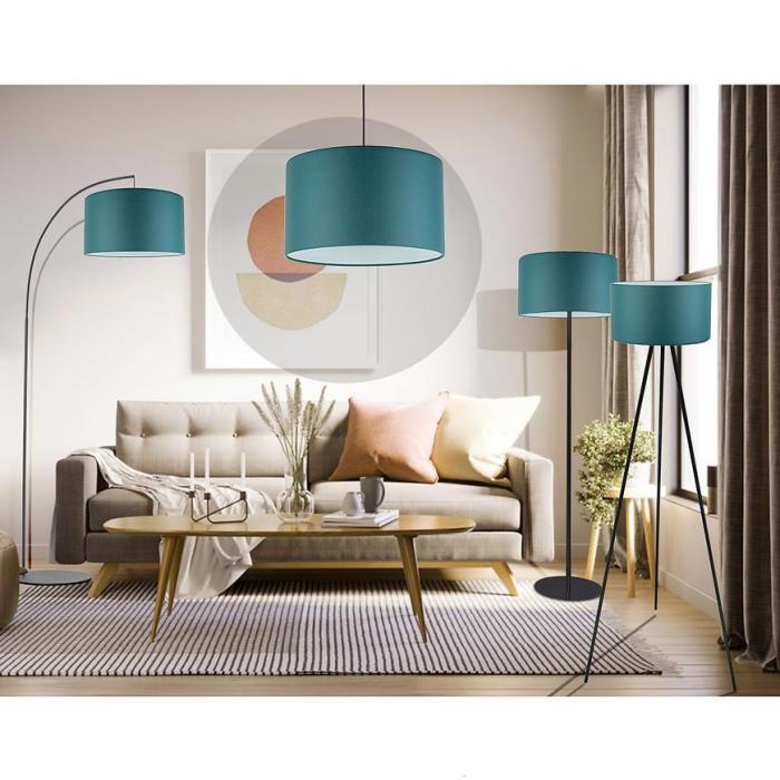 Abażur w kształcie walca, wykonany z tkaniny i metalu, gustownie ozdobi pomieszczenie i wpasuje się w większość aranżacji.