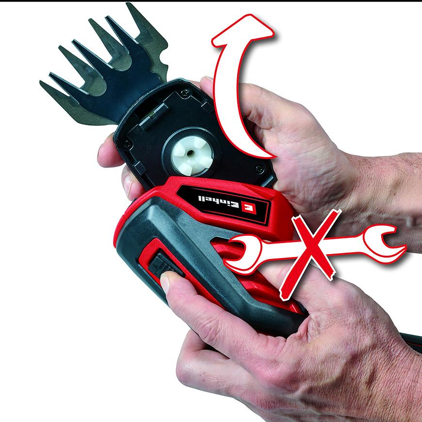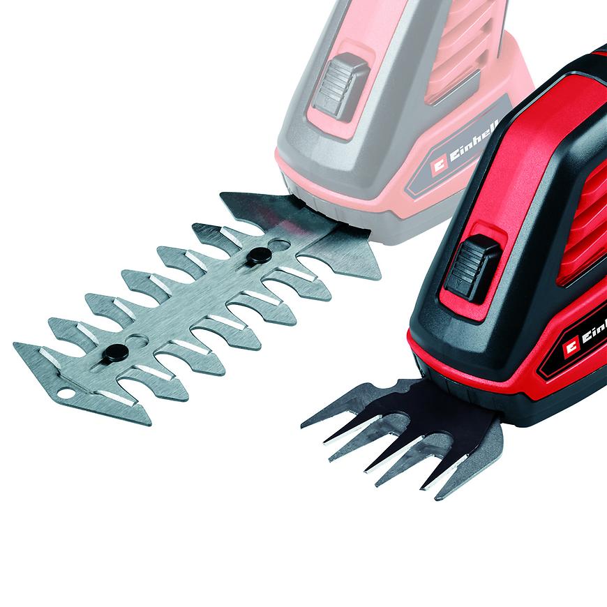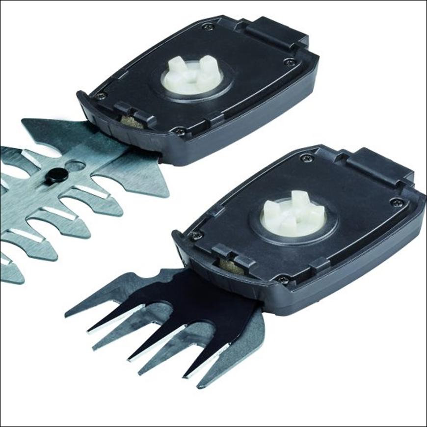 Urządzenie wyposażone jest w dwa wymienne ostrza – jedno do przycinania trawy (70 mm szerokości roboczej), drugie do cięcia krzewów i żywopłotów (długość 110 mm, maksymalna średnica gałęzi: 8 mm). Dzięki systemowi beznarzędziowej wymiany głowic, przełączanie się między trybami pracy jest szybkie i proste, bez użycia dodatkowych narzędzi.