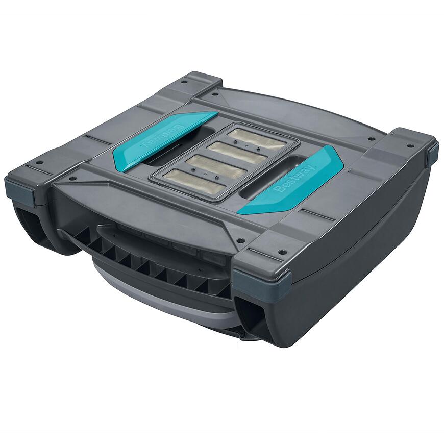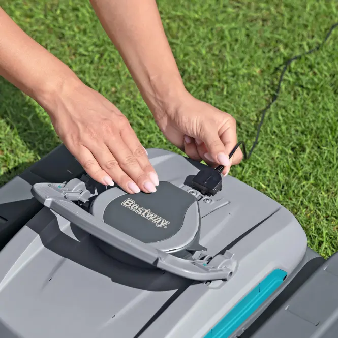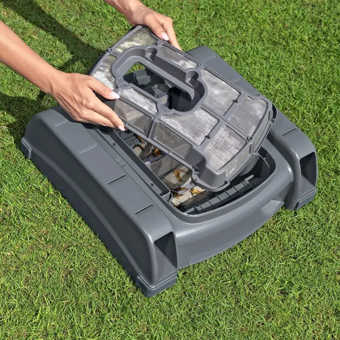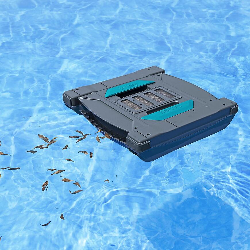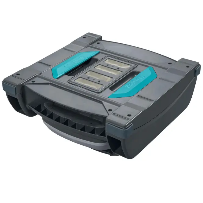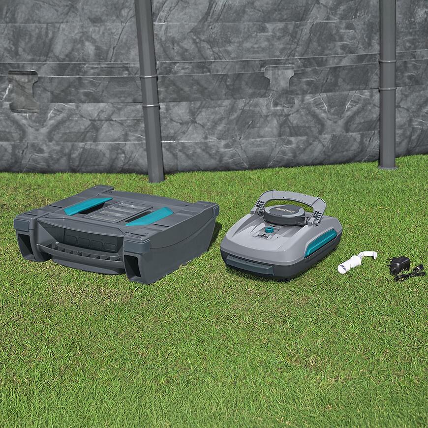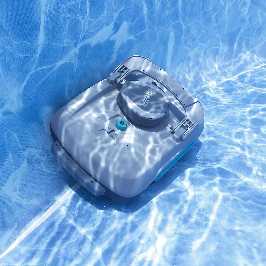 Robot posiada wbudowany akumulator, działający do 2 godzin, a pełne ładowanie zajmuje 3–4 godziny. Timer umożliwia automatyczne uruchamianie co godzinę. Duży pojemnik 3,5 L i skimmer 6 L umożliwiają zbieranie większych ilości zanieczyszczeń przed koniecznością czyszczenia. Czujniki chronią silnik – odkurzacz włącza się tylko po zanurzeniu w wodzie. W zestawie znajdują się odkurzacz, skimmer, ładowarka oraz zestaw do wyjmowania robota.