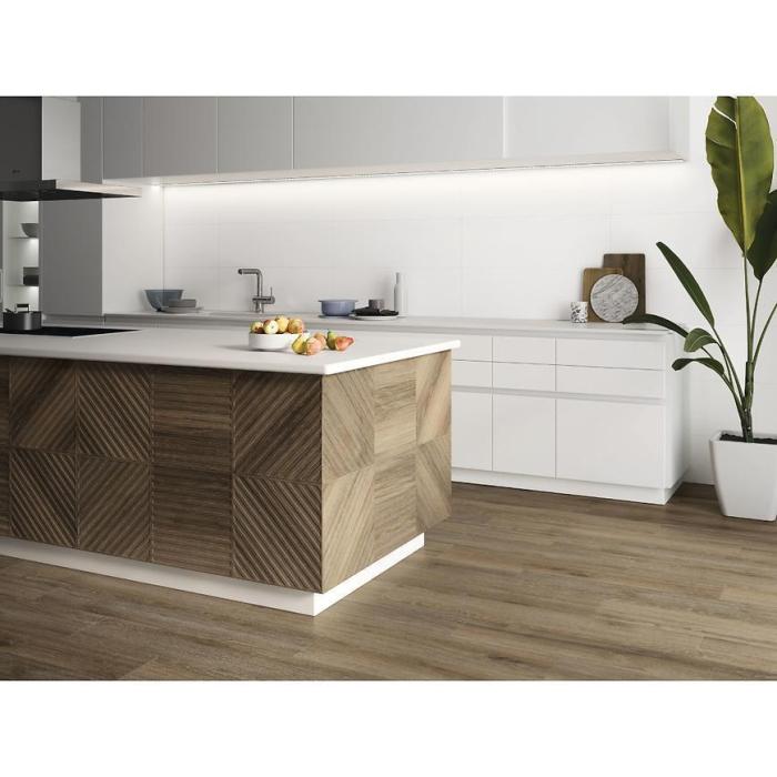 Płytka posiada drewnopodobne wzornictwo, które idealnie imituje strukturę naturalnego drewna, nadając wnętrzu wyjątkowego charakteru. Matowa powierzchnia podkreśla autentyczność wyglądu drewna i sprawia, że przestrzeń wydaje się elegancka, a jednocześnie przytulna.