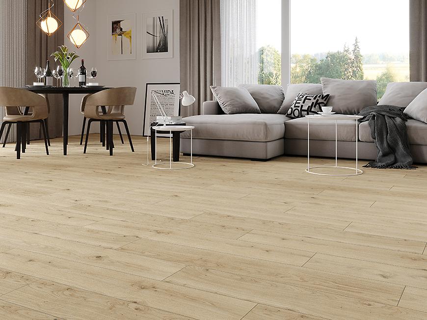 Matowa powierzchnia imituje naturalną fakturę drewna, ograniczając poślizg i dodając autentyczności. Brązowy odcień wnosi do wnętrz przytulność i głębię, harmonijnie komponując się z neutralnymi barwami oraz elementami drewna i metalu.