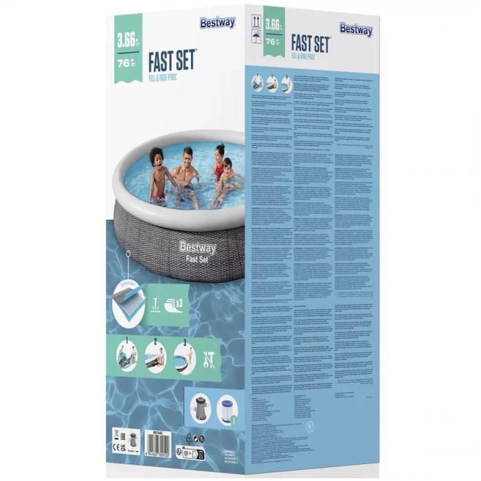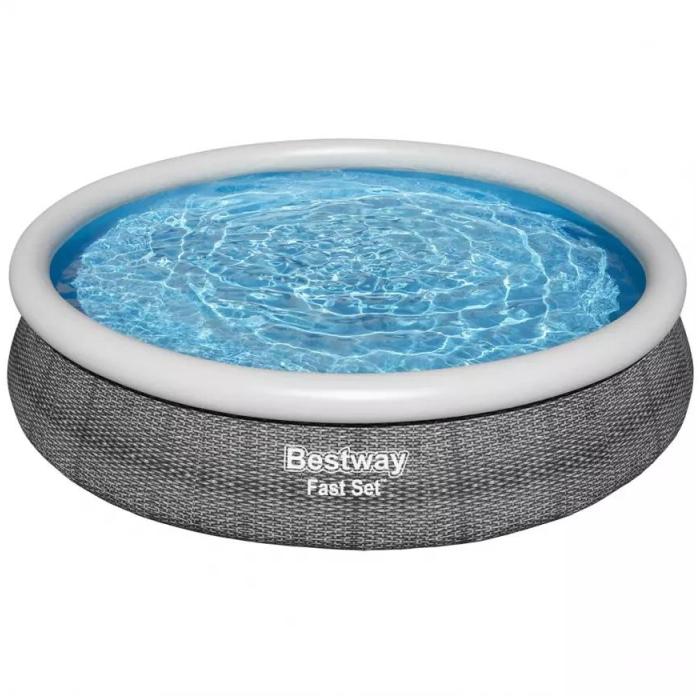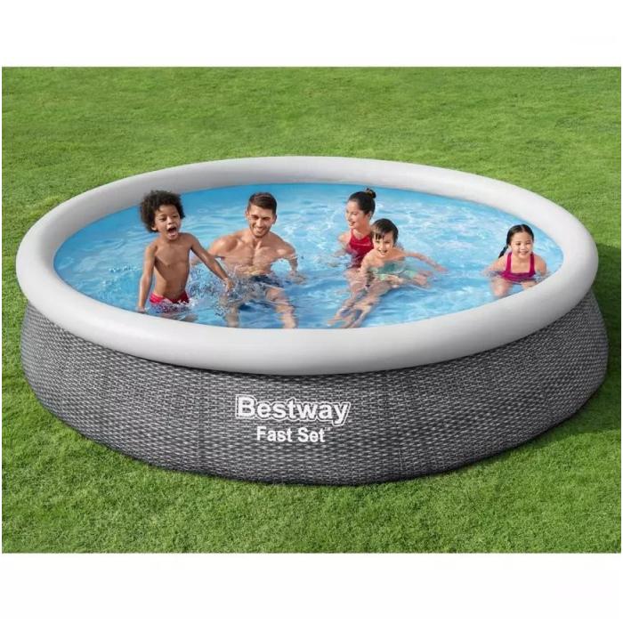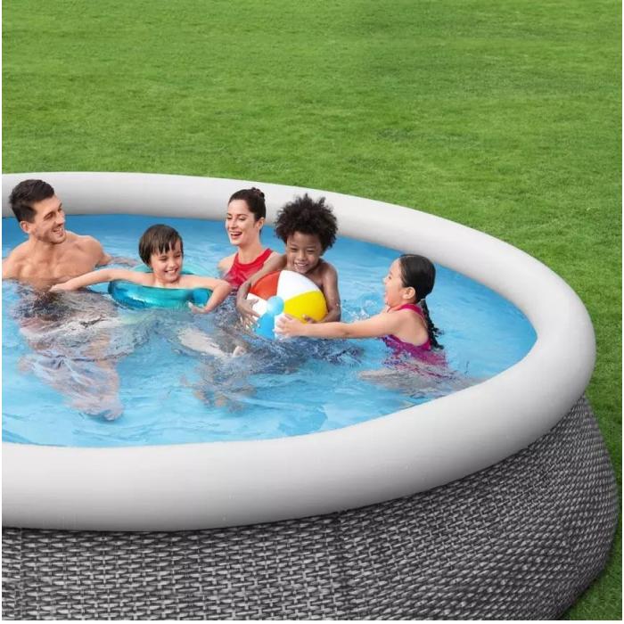 Proces konfiguracji, napełniania i podnoszenia jest prosty - wystarczy wybrać równą powierzchnię, nadmuchać górny pierścień, a basen będzie się unosił, gdy będzie wypełniany wodą. Wytrzymała niecka DuraPlus™ jest wykonana z bardzo wytrzymałego 3-warstwowego materiału, który jest wzmocniony w celu zwiększenia wytrzymałości i jest o 85% bardziej odporna na przebicie niż PVC. Po zakończeniu sezonu przechowywanie jest szybkie i proste. Woda jest łatwo uwalniana przez zawór spustowy sterujący przepływem, a następnie basen można złożyć w celu kompaktowego przechowywania poza sezonem. Do zestawu dołączona jest również pompka filtrująca, która pomaga utrzymać wodę w czystości.