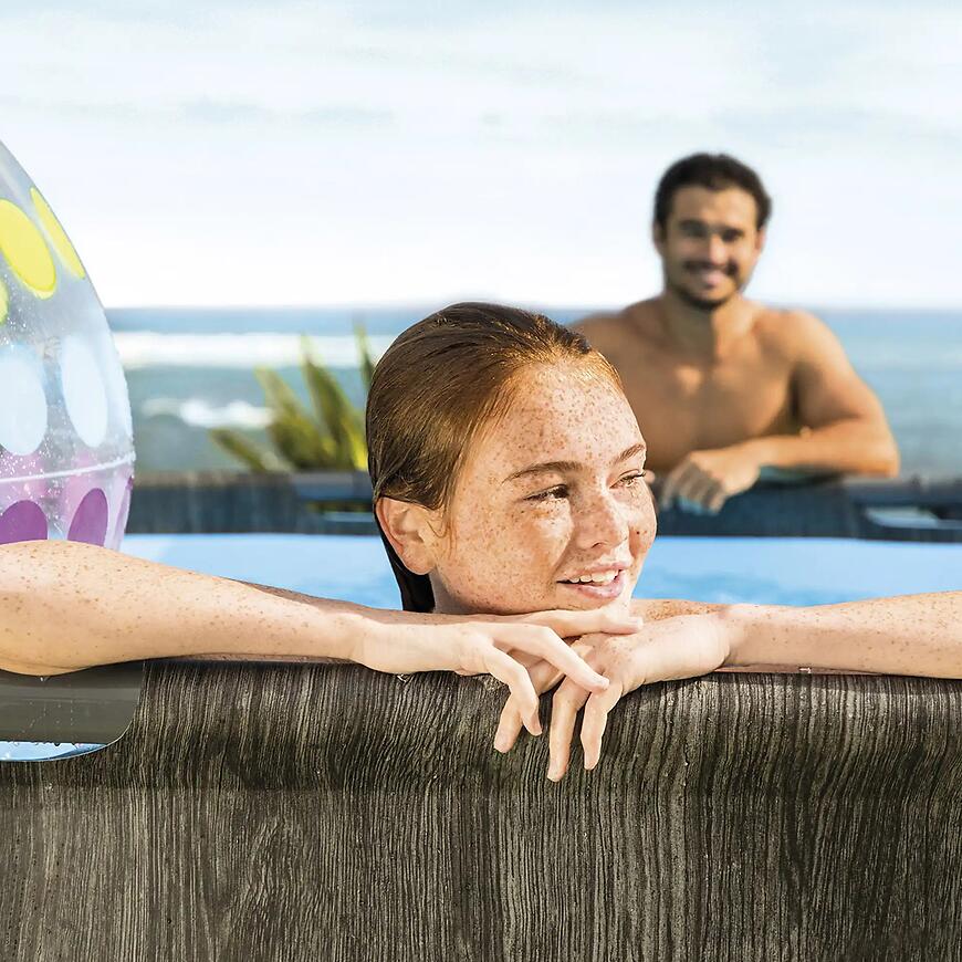Wzór Greywood inspirowany strukturą szarego drewna sprawia, że basen prezentuje się elegancko i nowocześnie. Taka stylistyka dobrze współgra z drewnianymi tarasami, kamiennymi ścieżkami oraz zielenią ogrodu. Basen nie dominuje przestrzeni wizualnie, a jednocześnie stanowi atrakcyjny element strefy wypoczynku.
