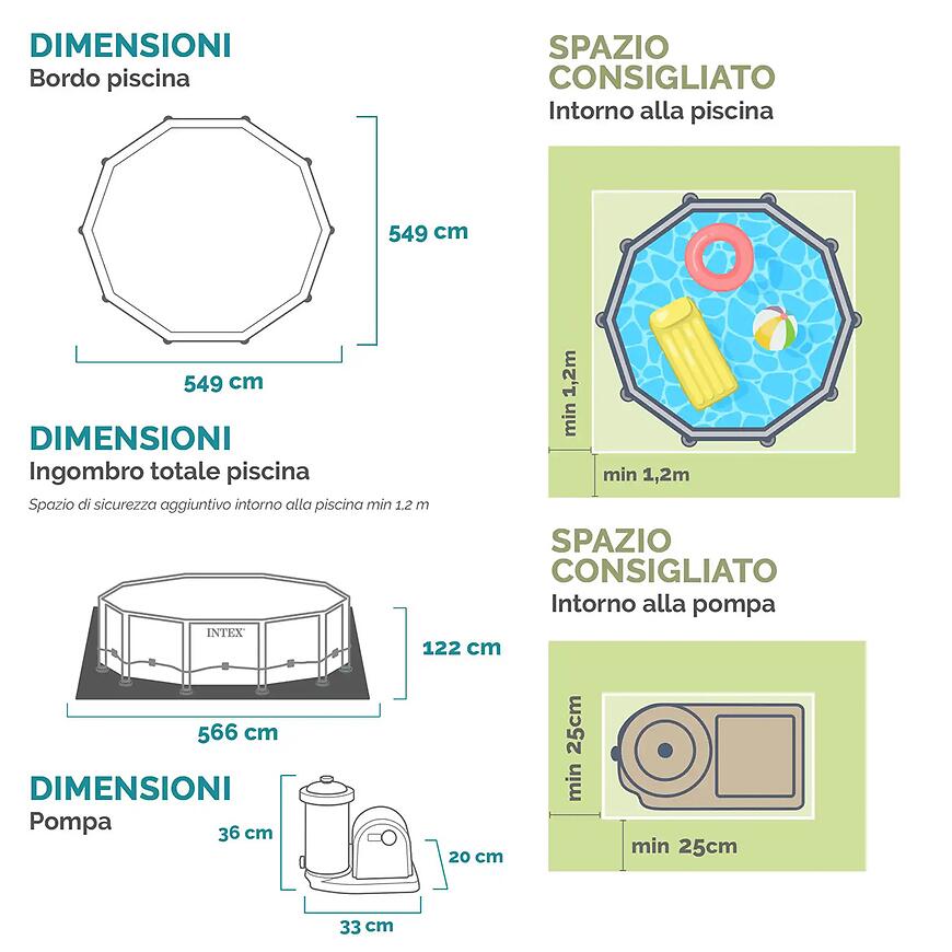 Model posiada okrągły kształt, średnicę 549 cm, wysokość 122 cm oraz maksymalną pojemność 24 311 litrów. Wyposażony jest w pompę filtracyjną oraz drabinkę, natomiast nie zawiera dodatkowych akcesoriów rekreacyjnych. Konstrukcja oparta jest na stalowym, ocynkowanym stelażu z powłoką antykorozyjną.