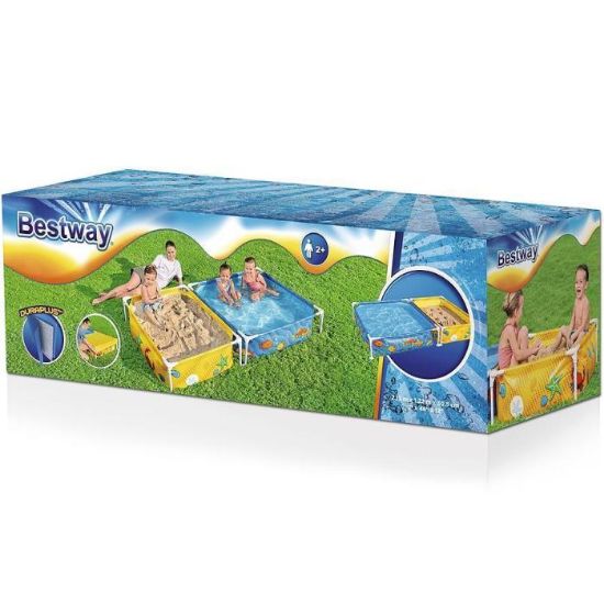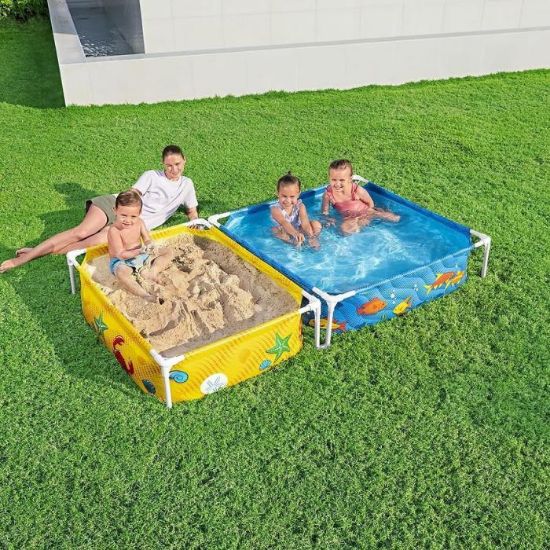 Basen stelażowy dziecięcy i piaskownica to świetna atrakcja dla dzieci podczas letnich zabaw w ogrodzie. Basen wystarczy napełnić wodą (Pojemność wodna (90%): 365 l (96 gal.), a pojemność piaskownicy to 200 kg.
