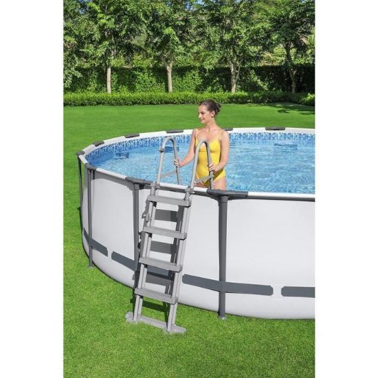 - Zawartość: jeden basen, pompa filtrująca (nr 58383), kompatybilna z wkładem typu II (nr 58094), drabinka zabezpieczająca (nr 58331), przykrycie basenu (nr 58037).