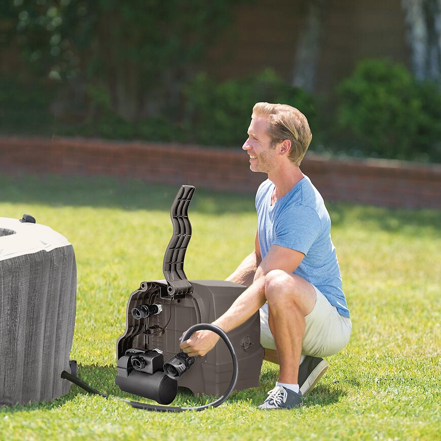 W zestawie znajduje się pompa filtracyjna kartuszowa, która odpowiada za utrzymanie czystości wody podczas użytkowania basenu z hydromasażem. Zastosowane wkłady filtrujące ułatwiają regularną konserwację i pozwalają ograniczyć czas poświęcony na pielęgnację wanny SPA.