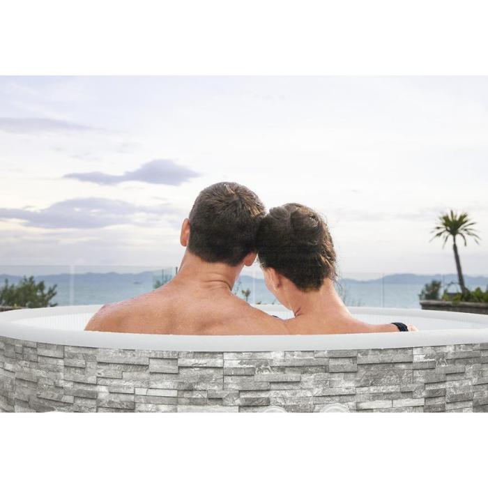 - Ściany wykonane są z materiału zszywanego, zapewniając mocne i trwałe spa o twardych bokach