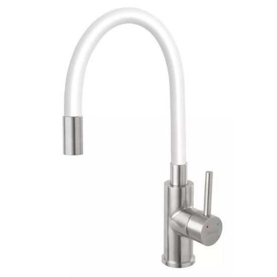 Bateria zlewozmywakowa FITNESS w kolorze stali szczotkowanej/białym, została wykonana z mosiądzu. Posiada ruchomą i elastyczną wylewkę.