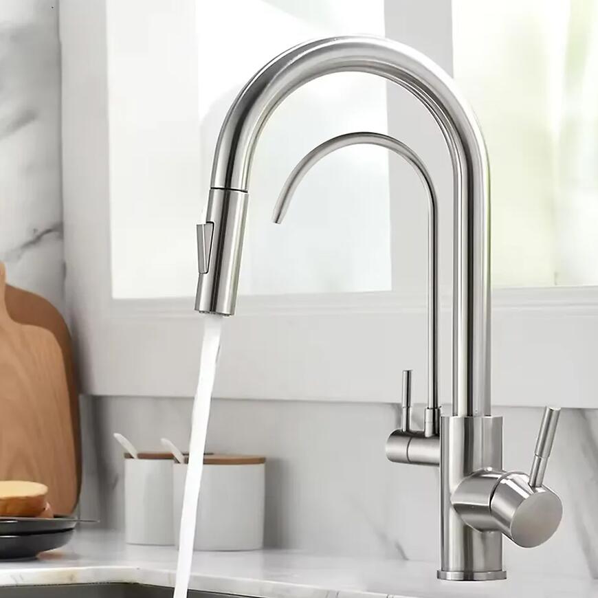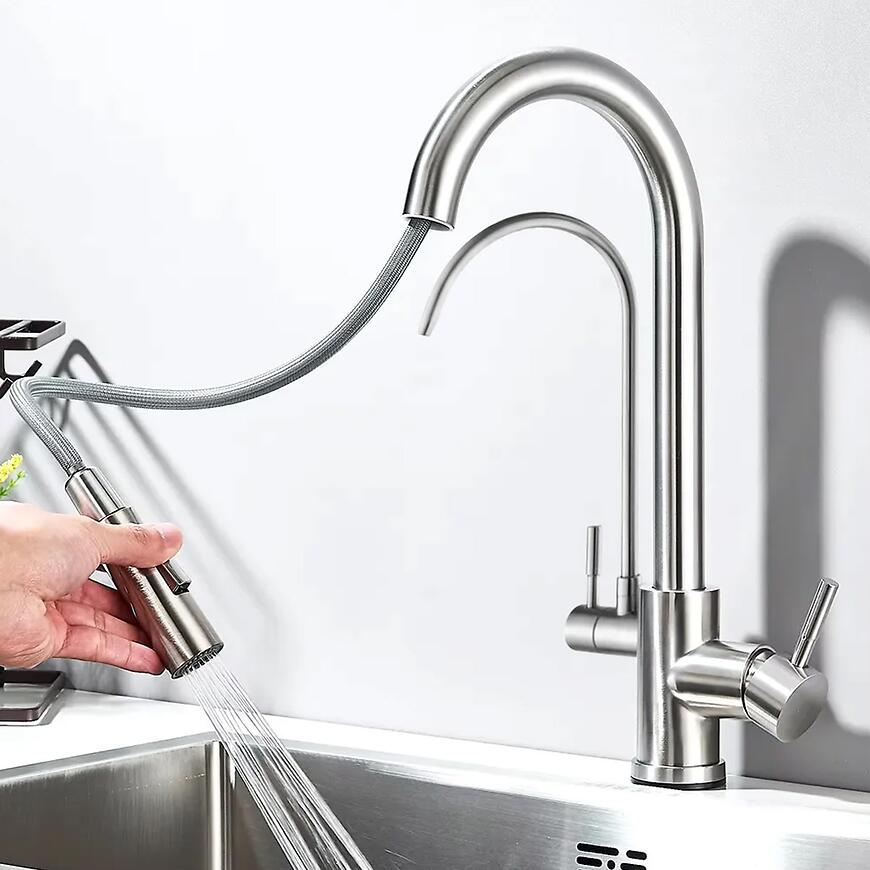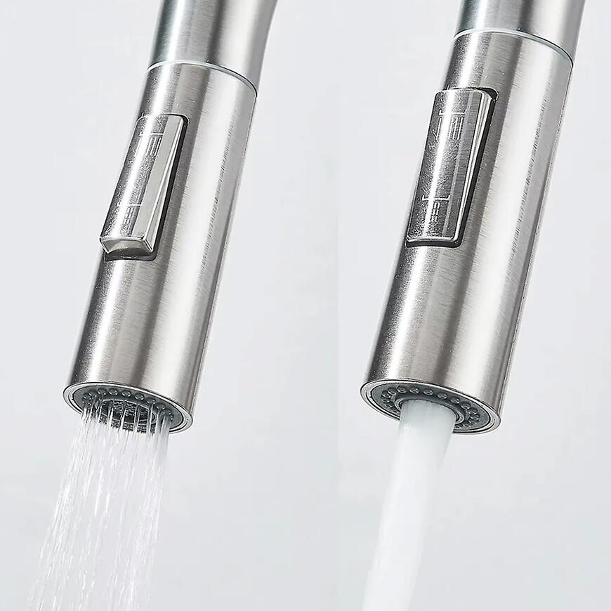 Ten model to bateria zlewozmywakowa z wyciąganą wylewką i możliwością obrotu, która umożliwia wygodne napełnianie garnków, mycie dużych naczyń oraz swobodne kierowanie strumieniem wody. Montaż jednootworowy stojący zapewnia szybkie i łatwe zamontowanie baterii bez dodatkowych akcesoriów.