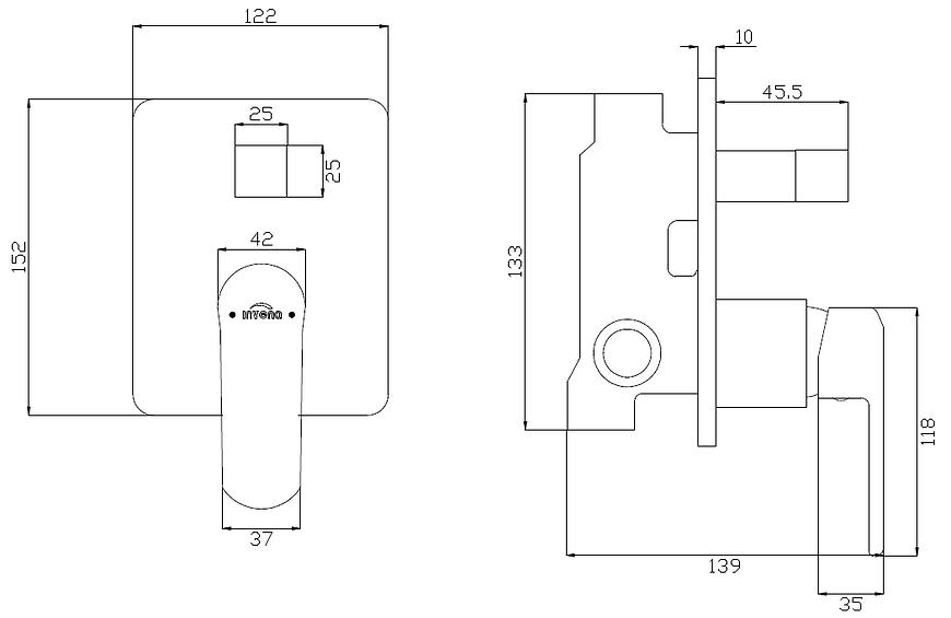 Bateria wykonana w kształcie kwadratowej rozety- osiada przełącznik natrysku. Idealnie wkomponuje się w strefę prysznicową.