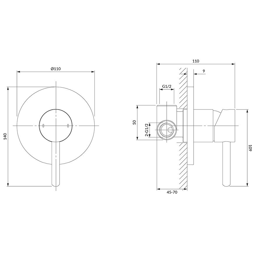 Bateria prysznicowa podtynkowa Y posiada dwa wejścia na wodę: ciepłą i zimną (1/2”), co umożliwia swobodne mieszanie wody i dostosowanie jej temperatury do indywidualnych preferencji. Dodatkowo, jedno wyjście wody zmieszanej (1/2”) zapewnia wygodne użytkowanie, eliminując konieczność stosowania skomplikowanych instalacji. Minimalna głębokość zabudowy wynosząca 4,5 cm sprawia, że montaż baterii jest prosty i szybki, co z pewnością doceni każdy majsterkowicz.
