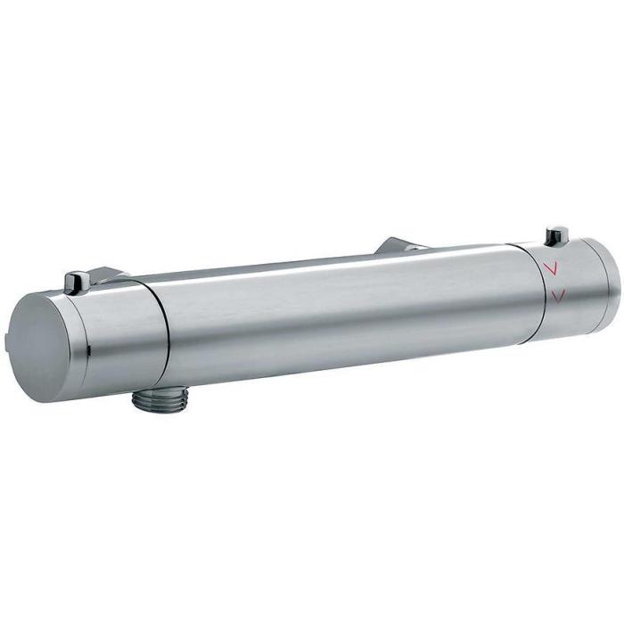 Bateria natryskowa termostatyczna w kolorze chrom została wykonana z mosiądzu.