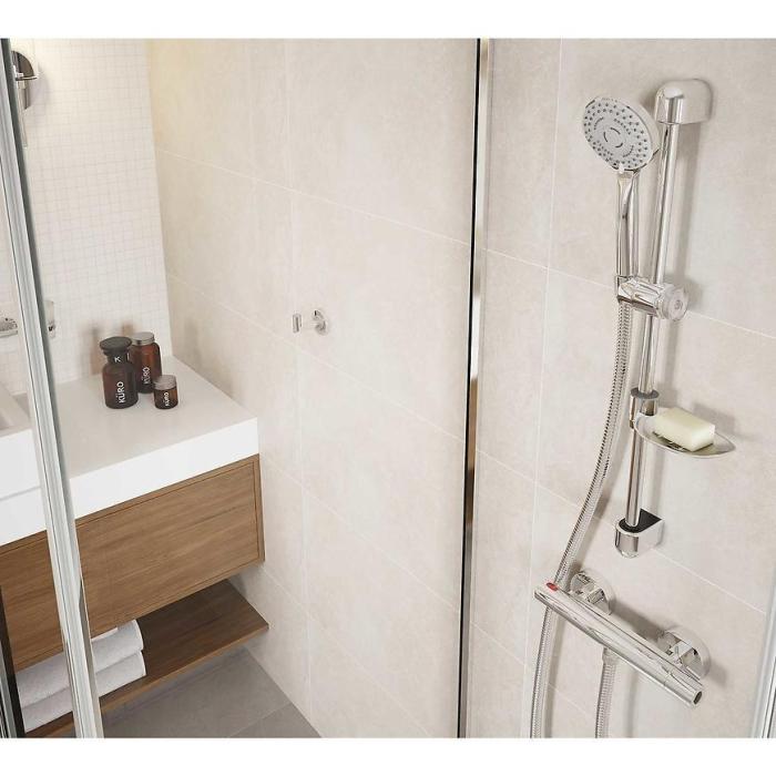Bateria natryskowa termostatyczna Trinity w kolorze chrom została wykonana z mosiądzu.