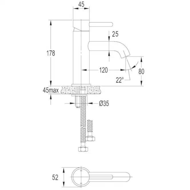 Bateria wyposażona jest w stałą wylewkę o zasięgu 12 cm oraz wysokości wypływu wody wynoszącej 8 cm, co sprawia, że jest idealna do standardowych umywalek, zapewniając komfort i łatwość w użytkowaniu. Całkowita wysokość baterii wynosi 17,8 cm, co sprawia, że jest wystarczająco kompaktowa, by zmieścić się w mniejszych łazienkach, ale jednocześnie zapewnia odpowiednią przestrzeń do wygodnego korzystania z umywalki.