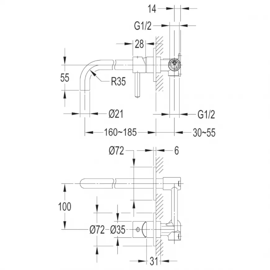 Bateria Y posiada stałą wylewkę o regulowanym zasięgu od 16 do 18,5 cm od powierzchni płytek, co zapewnia wygodę podczas mycia rąk i minimalizuje rozpryskiwanie wody. Optymalna głębokość zabudowy (minimalnie 4,5 cm) ułatwia instalację baterii i zapewnia jej kompatybilność z różnymi rodzajami ścian łazienkowych. Dzięki dołączonemu elementowi podtynkowemu montaż staje się prostszy, a bateria może być szybko i łatwo zamontowana przez fachowca.