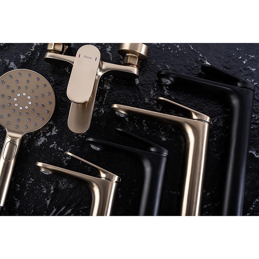 Bateria umywalkowa REA Marco złota szczotkowana łączy nowoczesny design z trwałą konstrukcją, tworząc elegancki element wyposażenia każdej łazienki. Kolor czarny przecierany nadaje wnętrzu wyrafinowanego charakteru i doskonale komponuje się z drewnem, kamieniem naturalnym, stalą nierdzewną oraz matowymi blatami. Model pasuje zarówno do nowoczesnych, jak i klasycznych aranżacji, wprowadzając harmonijny i designerski efekt wizualny.