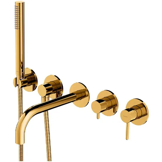 Poznaj elegancką baterię wannową 5-otworową podtynkową Y złotą — idealne rozwiązanie dla nowoczesnej łazienki. Zapewnia komfort użytkowania, stylowy wygląd i trwałość. Doskonała do montażu podtynkowego, dodając luksusowy akcent Twojej przestrzeni kąpielowej.