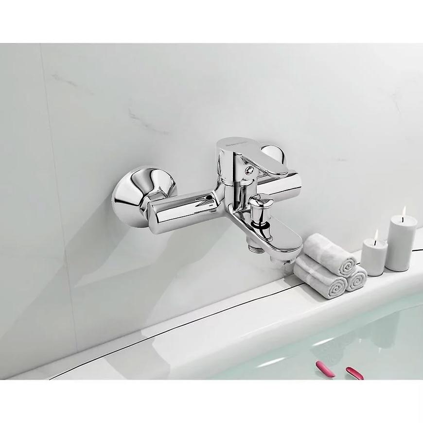 Bateria została zaprojektowana z dbałością o każdy szczegół. Jej elegancki chromowany kolor nadaje łazience nowoczesnego charakteru, doskonale komponując się z innymi elementami wyposażenia. Wykonana z trwałego mosiądzu, bateria jest nie tylko estetyczna, ale także solidna i odporna na uszkodzenia. Zastosowany perlator o specyfikacji 24x1 gwarantuje płynny i oszczędny przepływ wody, umożliwiając komfortowe korzystanie z wanny. Dzięki zaawansowanej głowicy typu R35, regulacja strumienia wody staje się precyzyjna i intuicyjna. Stała wylewka zapewnia równomierny strumień wody, tworząc relaksującą atmosferę podczas każdej kąpieli. System montażu dwuotworowy ścienny gwarantuje stabilność i pewność użytkowania. Bateria posiada standardowy rozstaw wynoszący 150 mm, co ułatwia jej instalację i dopasowanie do większości łazienek. Nie muszą się Państwo martwić o węże zasilające, ponieważ bateria jest gotowa do montażu i nie wymaga dodatkowych elementów.