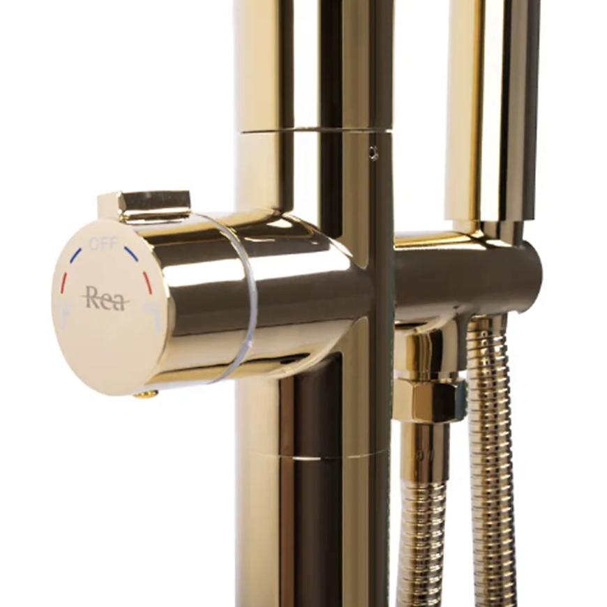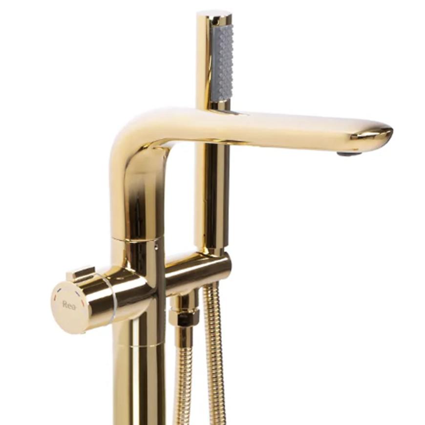 Bateria wannowa wolnostojąca Rea Clark w kolorze złotym to elegancki akcent do nowoczesnej łazienki. Wykonana z trwałego mosiądzu, łączy luksusowy wygląd z funkcjonalnością i komfortem użytkowania.