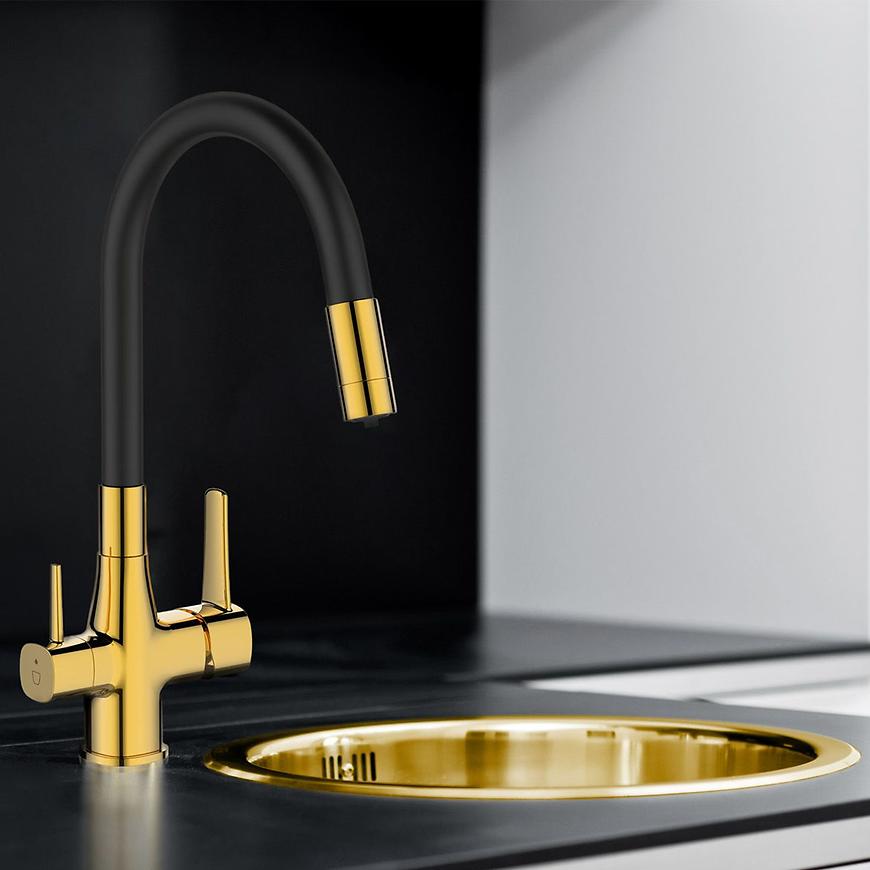 Bateria zlewozmywakowa Trend w kolorze gold z filtrem marki Invena to eleganckie i praktyczne rozwiązanie, które nie tylko ułatwia codzienne korzystanie z wody w kuchni, ale także dba o środowisko poprzez redukcję plastikowych opakowań.