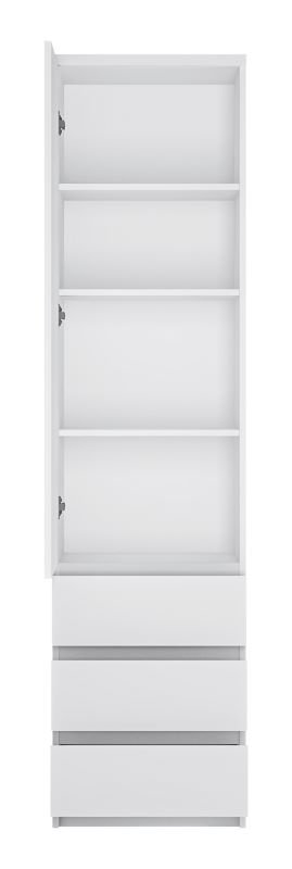 Dla tych, którzy cenią elegancję i funkcjonalność, idealnym rozwiązaniem będzie witryna jednodrzwiowa FRIV01 – z trzema pojemnymi szufladami i przeszkloną częścią, którą można opcjonalnie podświetlić. Oświetlenie LED wprowadza przyjemny, ciepły klimat wieczorami, tworząc idealne tło do relaksu.