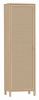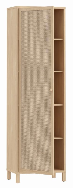 Stabilność i estetykę mebla zapewniają solidne nogi z płyty MDF o wysokości 10 cm, wyposażone w ślizgacze chroniące podłogę przed zarysowaniami. Naturalny akcent w postaci drewnianych uchwytów w kształcie gałek doskonale współgra z dekoracyjnymi rattanowymi panelami na drzwiach, które nadają szafie niepowtarzalny, lekki wygląd inspirowany naturą.