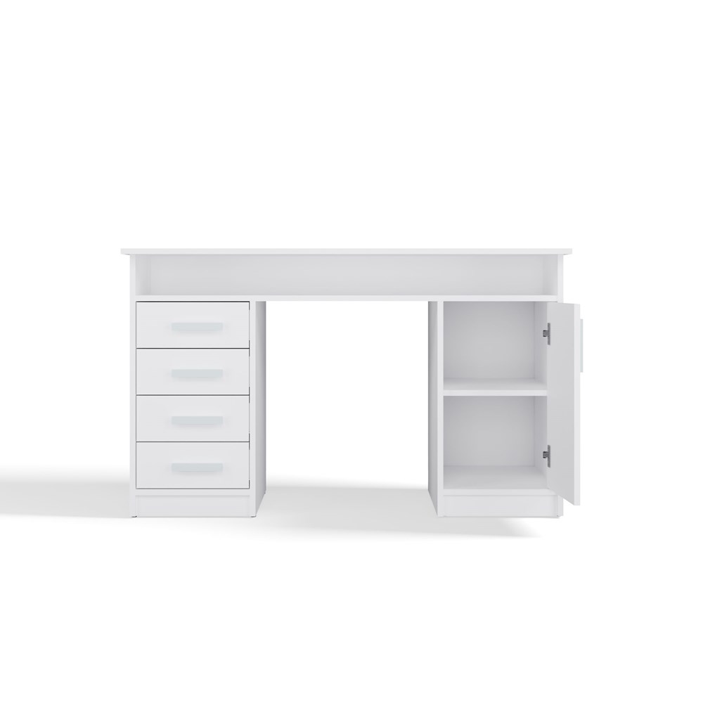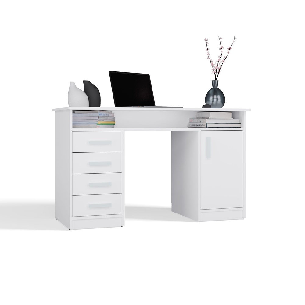 Biurko Adela w kolorze białym to funkcjonalne i eleganckie rozwiązanie dla osób, które cenią porządek oraz komfort podczas pracy i nauki. Doskonale sprawdzi się w różnych wnętrzach – od nowoczesnych po minimalistyczne – i idealnie pasuje zarówno do pokoju młodzieżowego, gabinetu, jak i domowego biura. Biurko zostało zaprojektowane z myślą o maksymalnej wygodzie przechowywania, oferując cztery pojemne szuflady oraz zamykany schowek z drzwiami i dwiema półkami, które pomieszczą dokumenty, książki czy niezbędne akcesoria biurowe. Dodatkowa otwarta półka pod blatem pozwala na wygodne przechowywanie drobnych przedmiotów, laptopa czy zeszytów, dzięki czemu przestrzeń robocza pozostaje zawsze uporządkowana.