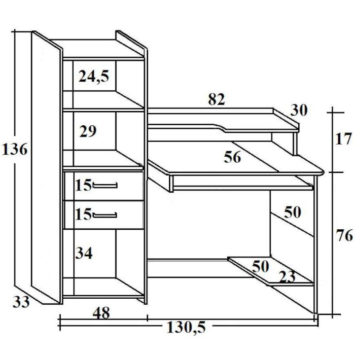 Meble zostały wykonane z płyty wiórowej laminowanej w kolorze dąb artisan/grafit. Dzięki swojej klasycznej kolorystyce, będą pasowały do każdego wnętrza. Nowoczesny styl mebli wpadnie do gustu każdemu, kto poszukuje eleganckiego, klasycznego, a zarazem nowoczesnego umeblowania. Biurko posiada regał z półkami i szufladami o wysokości 76/136cm. Orientacja biurka: lewostronna.