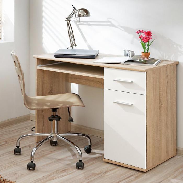 Meble zostały wykonane z płyty wiórowej laminowanej w kolorze dąb sonoma/biały. Dzięki swojej klasycznej kolorystyce, będą pasowały do każdego wnętrza. Nowoczesny styl mebli wpadnie do gustu każdemu, kto poszukuje eleganckiego, klasycznego, a zarazem nowoczesnego umeblowania. Orientacja biurka: prawostronna.