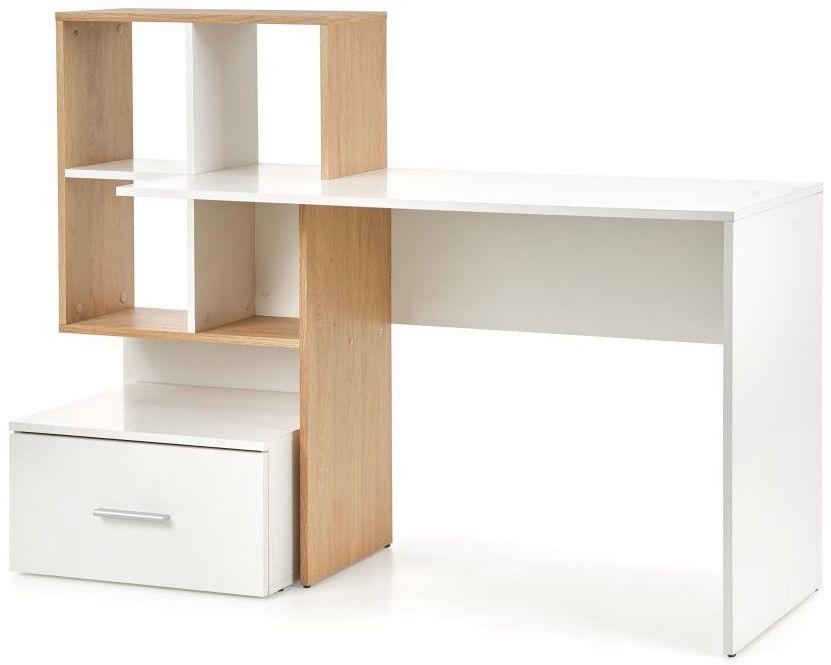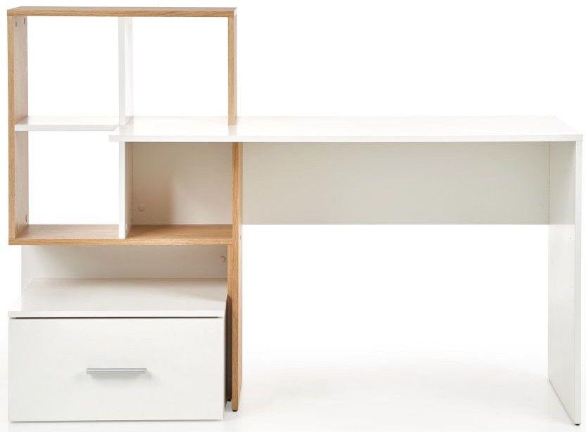 Nowoczesność i funkcjonalność - tak w skrócie można opisać biurko Antar. Antar to niezwykle nowoczesne biurko z regałem, które znajdzie wiele zastosowań. Konstrukcja przypadnie do gustu zwłaszcza tym osobom, które cenią sobie dobrą organizację w miejscu pracy. Biurko posiada blat, którego powierzchnia użytkowa pozwoli na wygodną pracę lub naukę. Regał oraz szuflada pomogą natomiast w przechowywaniu materiałów biurowych. Biurko można wykorzystać w domowym gabinecie lub umieścić w pokoju młodzieżowym. Pomimo swoich możliwości, mebel charakteryzuje się stosunkowo niewielkimi rozmiarami, dlatego nie zajmie dużej ilości metrażu w pomieszczeniu. Biurko Antar wykonane zostało w całości z płyty meblowej laminowanej. Biurko oraz szuflada posiadają biały kolor, natomiast regał wykończony został w odcieniu dąb złoty. Taka kolorystyka pozwoli dopasować biurko niemal do każdego wnętrza.