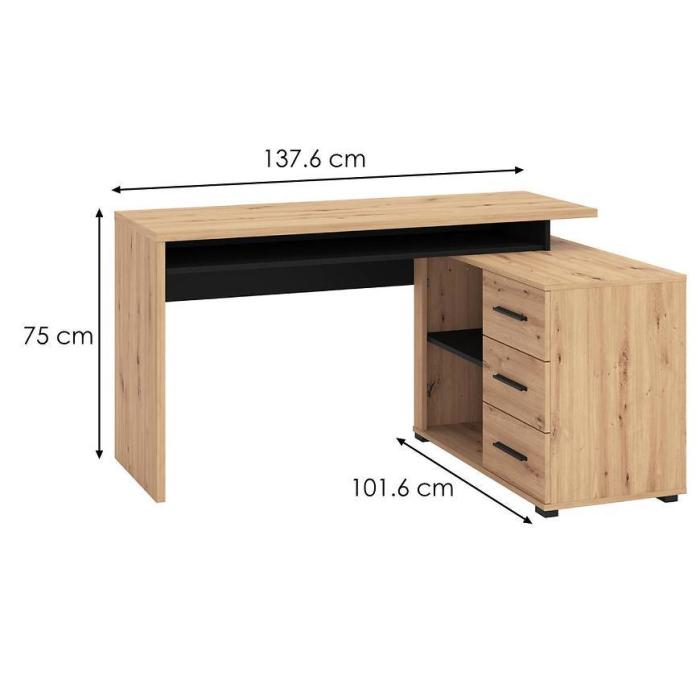 Biurko posiada szerokość 137,6 cm, głębokość 101,6 cm i wysokość 75 cm, co zapewnia obszerny blat roboczy. Prostokątny kształt umożliwia wygodne ustawienie monitora, laptopa i niezbędnych akcesoriów, a jednocześnie pozostawia miejsce do swobodnego poruszania się i pracy w pozycji siedzącej.