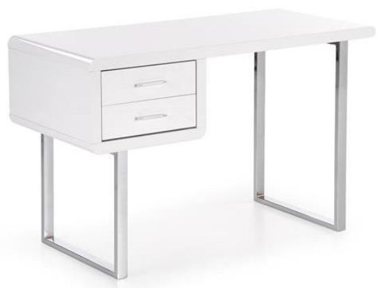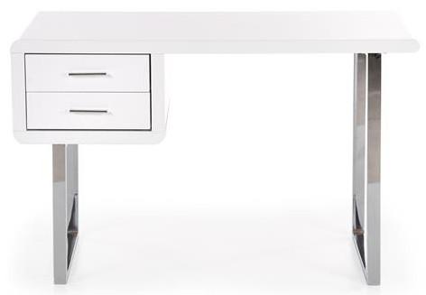 Nowoczesność i niespotykany design - tak w skrócie można opisać biurko Aria. Duży blat biurka, który wykonano z lakierowanej na wysoki połysk białej płyty MDF, pozwoli na bezproblemowe rozłożenie niezbędnych materiałów do pracy lub nauki tj. laptop, książki i zeszyty. Te nowoczesne biurko posiada zintegrowany kontenerek z dwoma szufladami, dzięki którym możliwe będzie przechowywanie ważnych rzeczy w postaci dokumentów, książek, długopisów itp. Stabilna podstawa biurka zrobiona została z chromowanego metalu, który doskonale współgra z błyszczącą bielą blatu. Biurko Aria zaprojektowano z myślą o miłośnikach awangardowych mebli, które oprócz bycia funkcjonalnymi mają pełnić także funkcję integralnej części wyposażenia mieszkania lub biura, po to by cieszyć oczy niebanalną formą. Białe meble optycznie rozjaśniają i powiększają pomieszczenie. Dzięki zastosowaniu lakierowanego MDFu biurko bardzo łatwo utrzymać w czystości - wystarczy miękka ściereczka by pozbyć się kurzu. Warto pamiętać, by do biurka dopasować odpowiedni fotel lub krzesło zapewniające komfort podczas pracy i nauki.