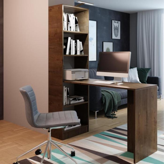 Biurko B-1 to praktyczny mebel. Wykonane zostało z płyty wiórowej laminowanej w kolorze jesion ciemny. Dzięki starannemu wykończeniu posłuży przez wiele lat. Idealnie wpasuje się w nowoczesne wnętrza. Dzięki swojemu wybarwieniu będzie pasować do większości aranżacji np. w pokoju młodzieżowym. Dodatkowym atutem jest regał, na którym można położyć książki czy inne potrzebne rzeczy podczas pracy, nauki. Orientacja: lewe.