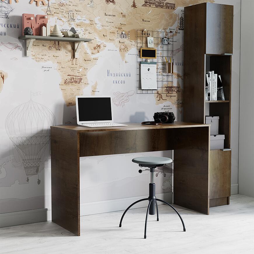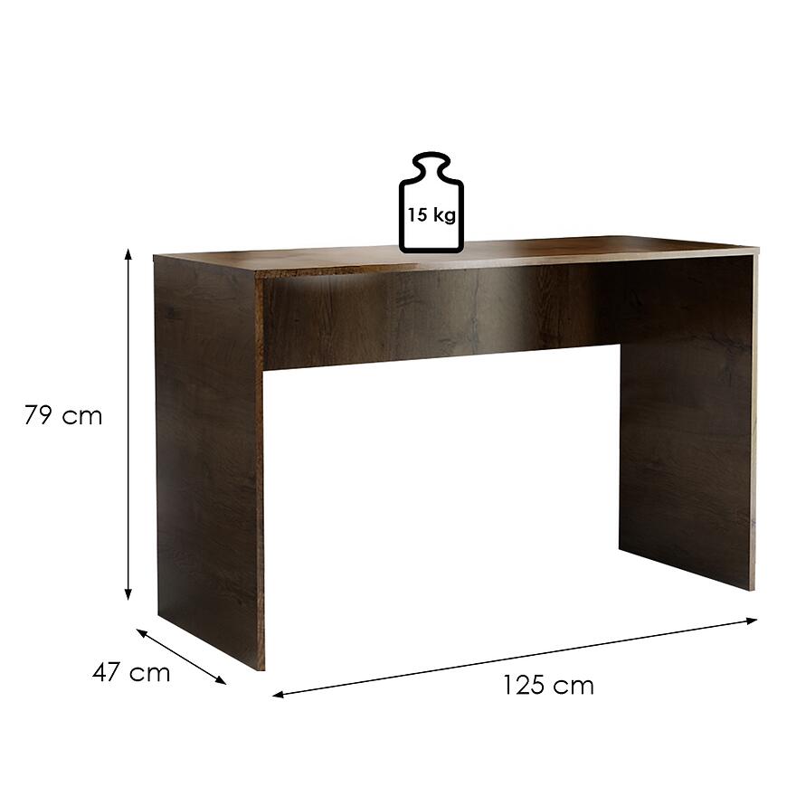 Biurko B3 w kolorze Jesion Ciemny to eleganckie i funkcjonalne biurko z kolekcji B3 o nowoczesnym designie. Jego wymiary wynoszą 125 cm szerokości, 79 cm wysokości i 47 cm głębokości. Fronty oraz korpus wykonano z laminowanej płyty wiórowej o matowym wykończeniu, co nadaje meblowi ciemny, drewnopodobny wygląd. Biurko ma uniwersalną orientację, nie posiada drzwi ani szuflad, waży 20 kg i wymaga samodzielnego montażu.