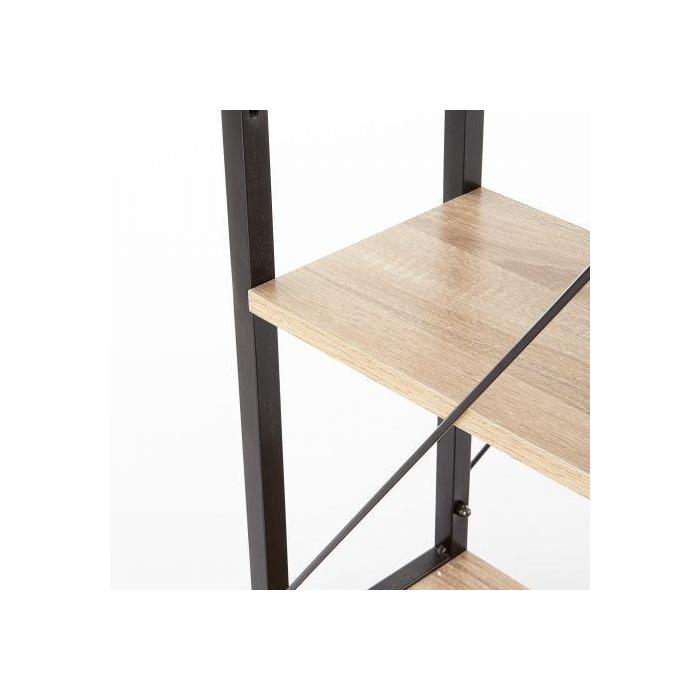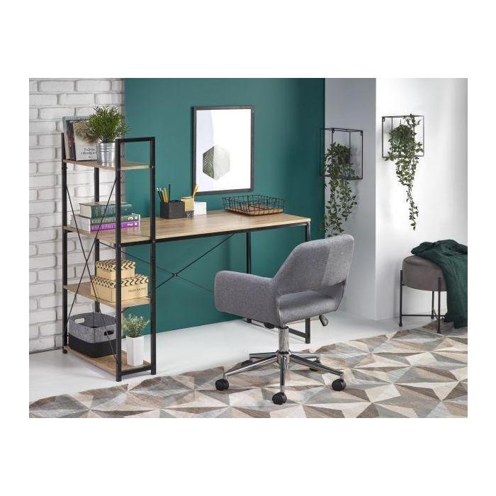 Blat biurka wykonany jest z wysokiej jakości płyty meblowej laminowanej w kolorze sonoma, który wprowadza ciepły, naturalny akcent do wnętrza. Konstrukcja biurka jest solidna i stabilna dzięki stalowym elementom malowanym proszkowo na czarno, co nadaje meblowi nowoczesny i elegancki wygląd.