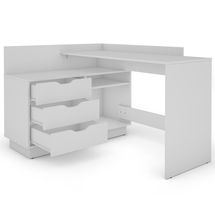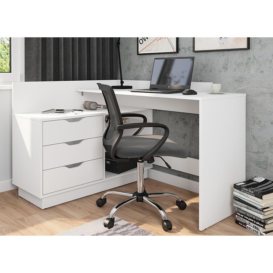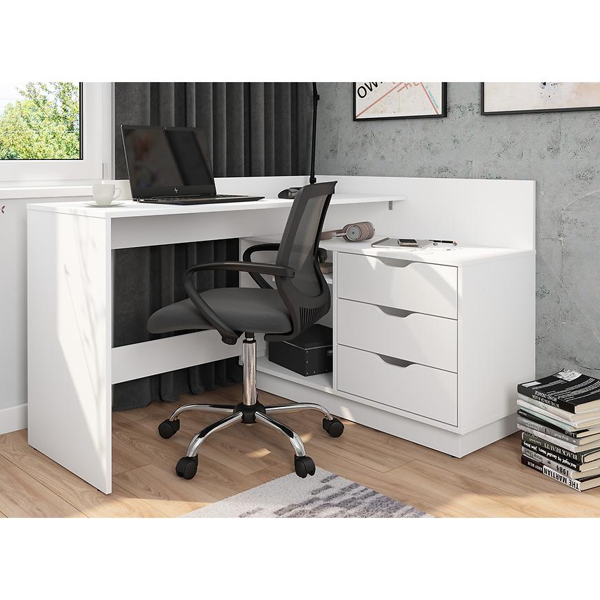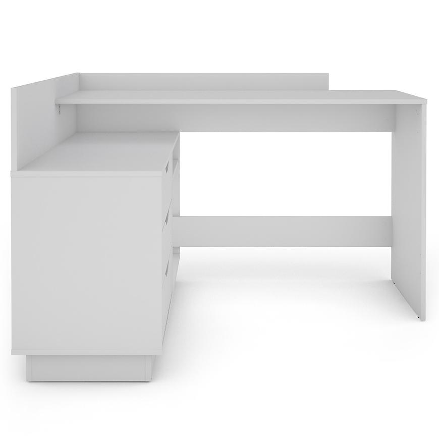 Biurko charakteryzuje się uniwersalną orientacją, co oznacza, że można je z łatwością dopasować do każdego rodzaju wnętrza oraz indywidualnych potrzeb użytkownika. Zarówno fronty, jak i korpus biurka wykonane są z wysokiej jakości płyty wiórowej laminowanej, co zapewnia wytrzymałość, stabilność oraz długą żywotność mebla. Białe wybarwienie biurka dodaje mu nowoczesnego, minimalistycznego wyglądu, a matowe wykończenie zarówno frontów, jak i korpusu sprawia, że mebel prezentuje się elegancko i stylowo, wpisując się w modną estetykę prostoty.
