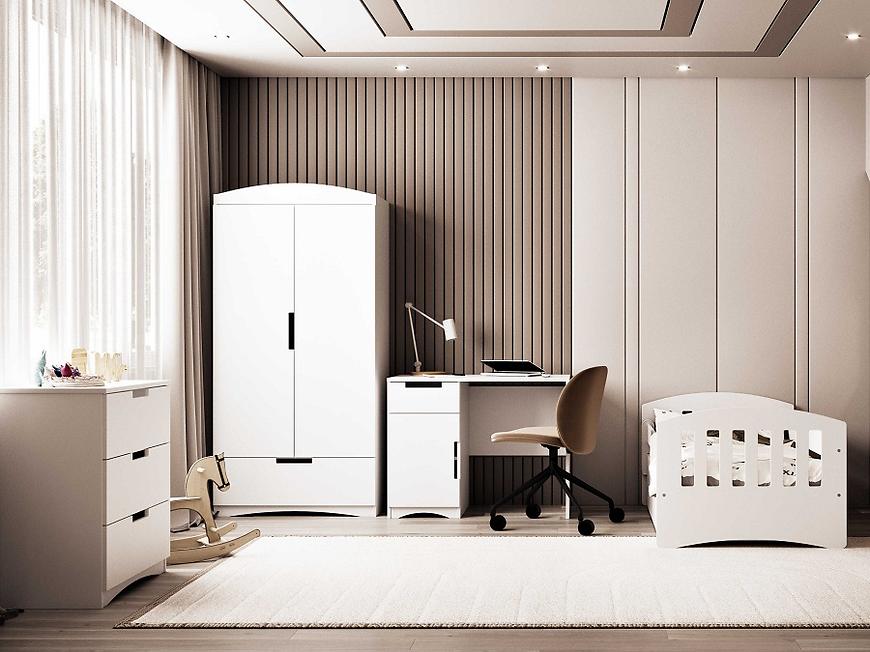 Biały kolor biurka nadaje mu uniwersalny charakter, doskonale komponując się z różnymi aranżacjami wnętrz. Konstrukcja z płyty wiórowej lakierowanej gwarantuje trwałość i łatwość utrzymania w czystości. Dodatkowo, płyta wiórowa laminowana w konstrukcji korpusu dodaje wytrzymałości i stabilności.