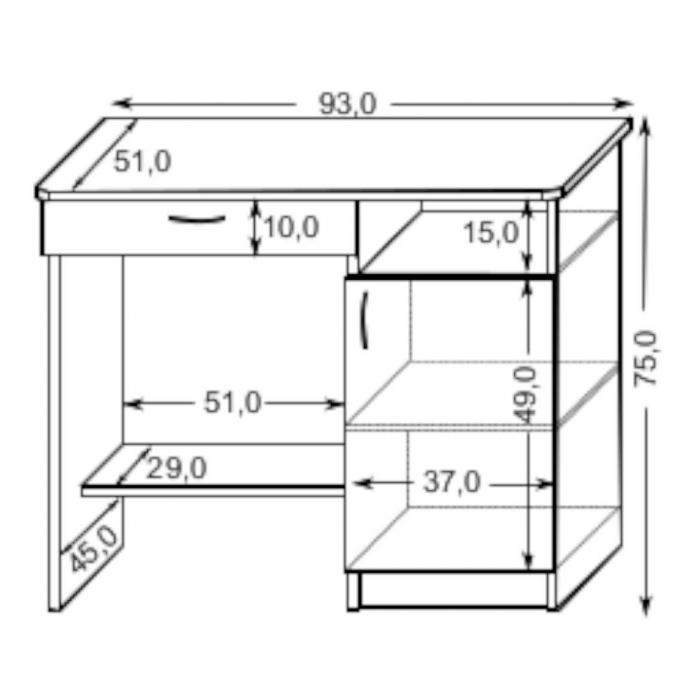 Biurko ma szerokość 93 cm, głębokość 51 cm i wysokość 75 cm, co zapewnia odpowiednią powierzchnię roboczą dla osoby korzystającej z laptopa, monitora czy dokumentów. Prostokątny kształt blatu pozwala na ergonomiczne ustawienie sprzętu komputerowego, akcesoriów biurowych oraz materiałów do pracy czy nauki.