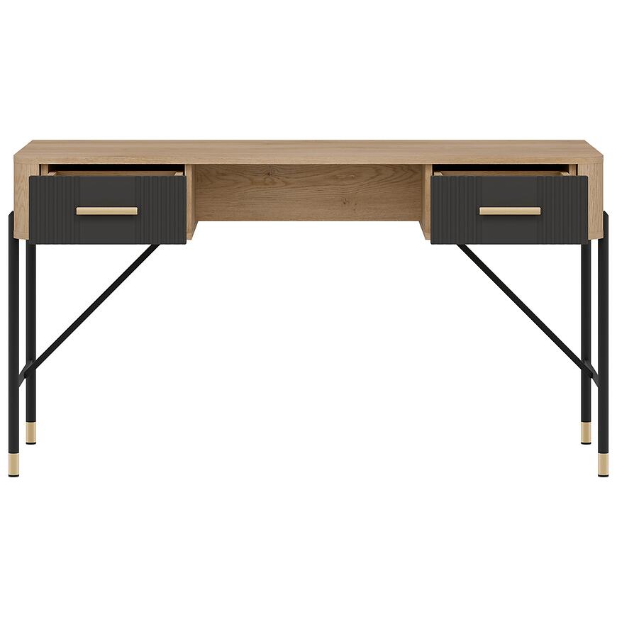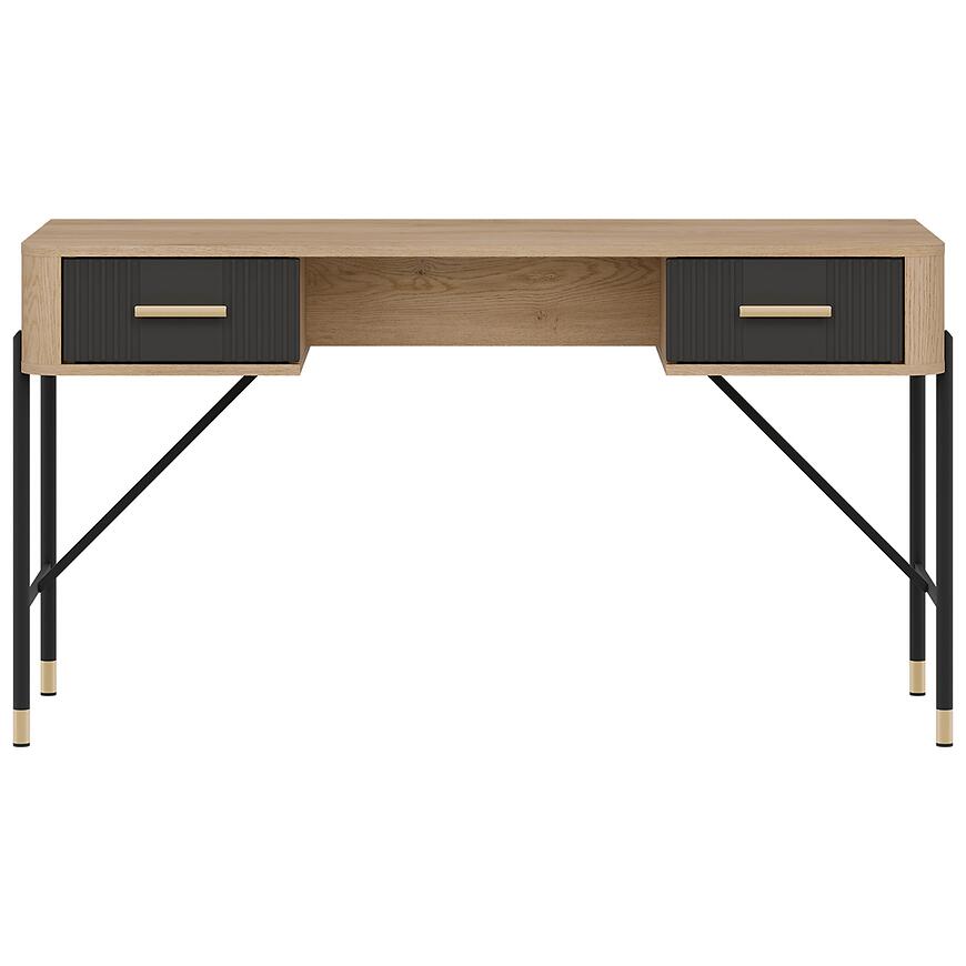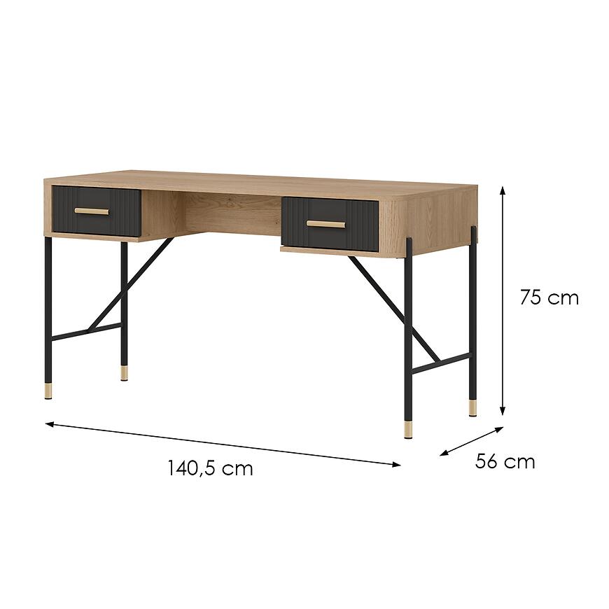 Korpus biurka wykonany jest z laminowanej płyty wiórowej w kolorze dąb Cremona, a fronty z płyty MDF w matowym wykończeniu antracytowym. Takie połączenie materiałów gwarantuje trwałość, odporność na codzienne użytkowanie i łatwość utrzymania czystości. Biurko Dante Dt23 wyposażone jest w dwie pojemne szuflady, które umożliwiają przechowywanie dokumentów, przyborów biurowych czy innych akcesoriów, utrzymując porządek na blacie.