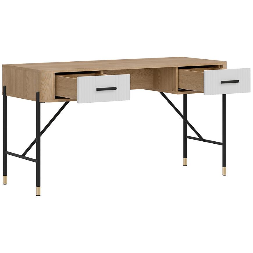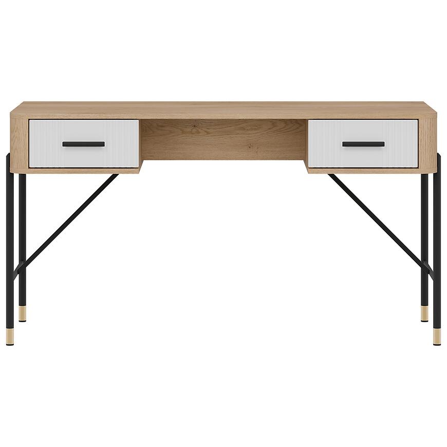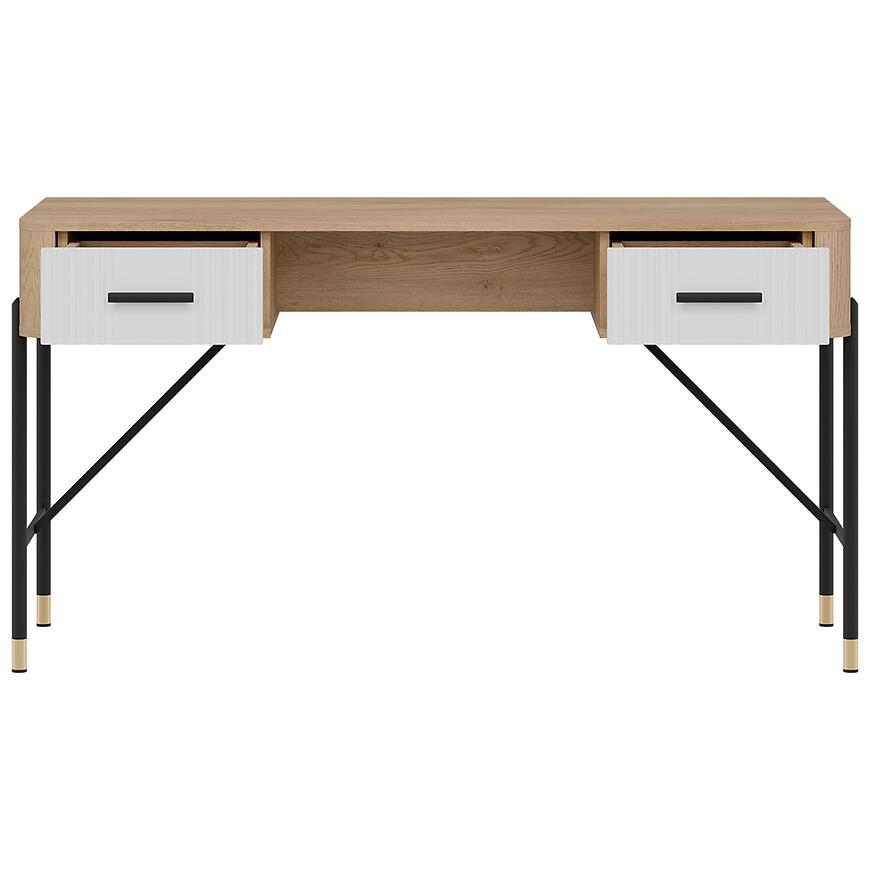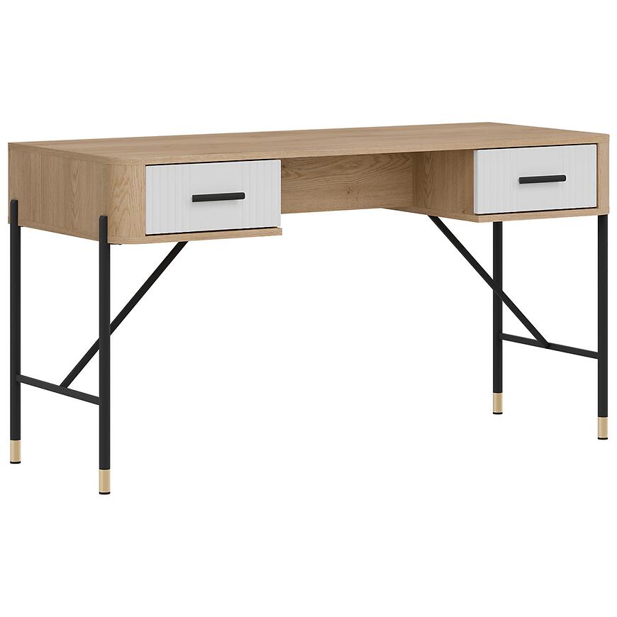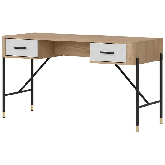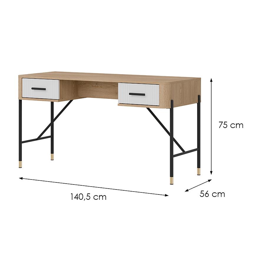 Korpus biurka wykonany jest z laminowanej płyty wiórowej w kolorze dąb Cremona, a fronty z płyty MDF w białym, matowym wykończeniu. Takie połączenie materiałów gwarantuje trwałość, odporność na codzienne użytkowanie i łatwość utrzymania czystości. Dwie pojemne szuflady zapewniają miejsce na dokumenty, przybory biurowe czy akcesoria, umożliwiając utrzymanie porządku na blacie i zwiększając funkcjonalność biurka.