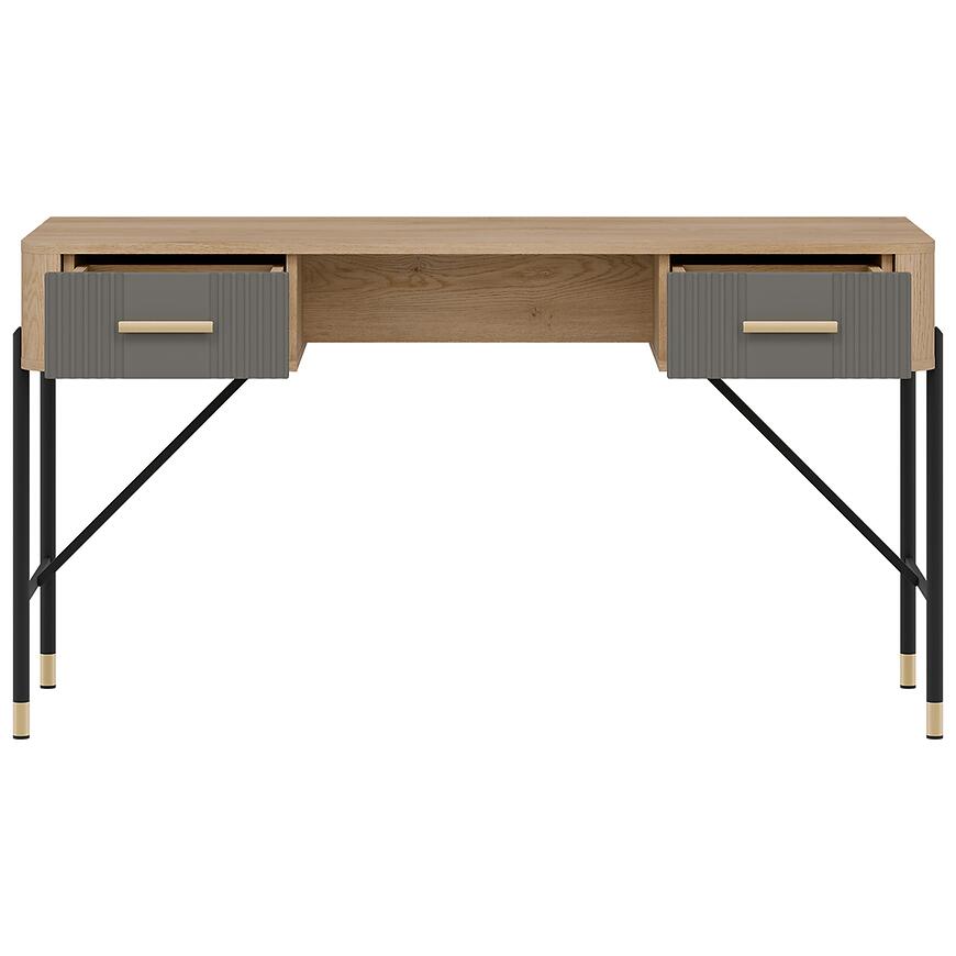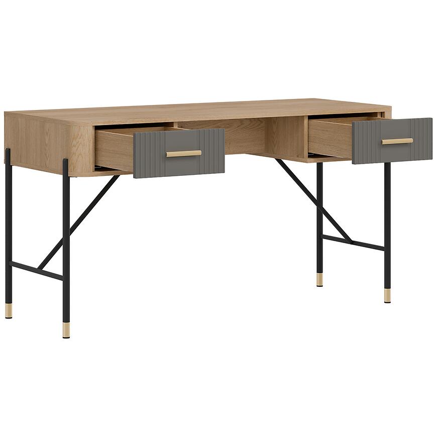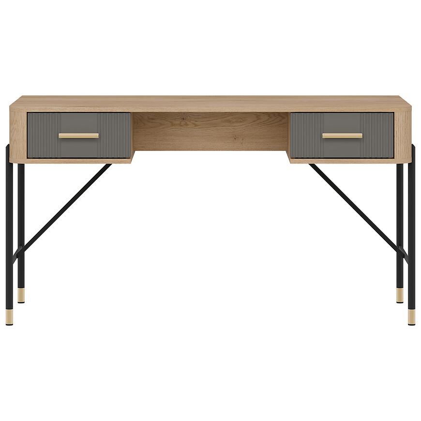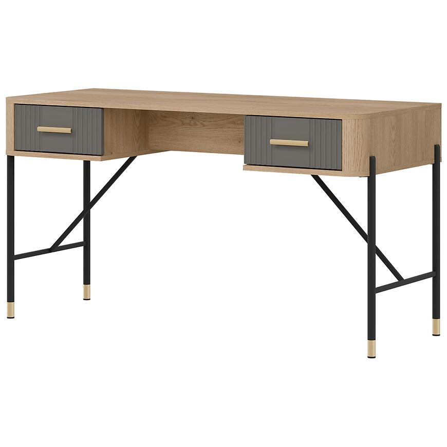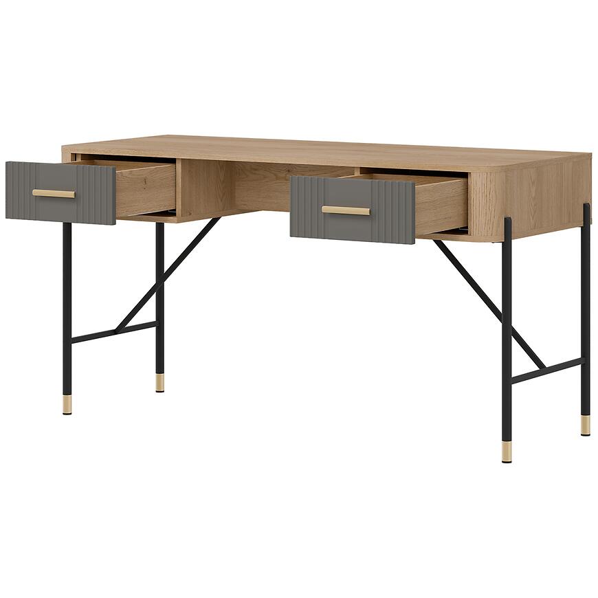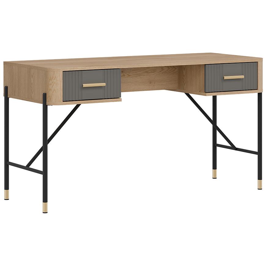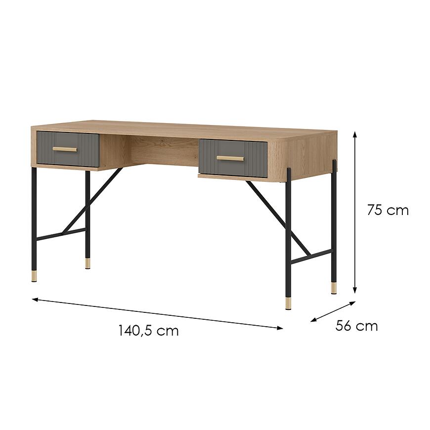 Korpus biurka wykonany jest z laminowanej płyty wiórowej w kolorze dąb Cremona, a fronty z płyty MDF w szarym matowym wykończeniu. Takie połączenie materiałów zapewnia trwałość, odporność na codzienne użytkowanie oraz łatwość utrzymania czystości. Dwie pojemne szuflady umożliwiają wygodne przechowywanie dokumentów, przyborów biurowych oraz innych akcesoriów, pomagając zachować porządek na blacie.