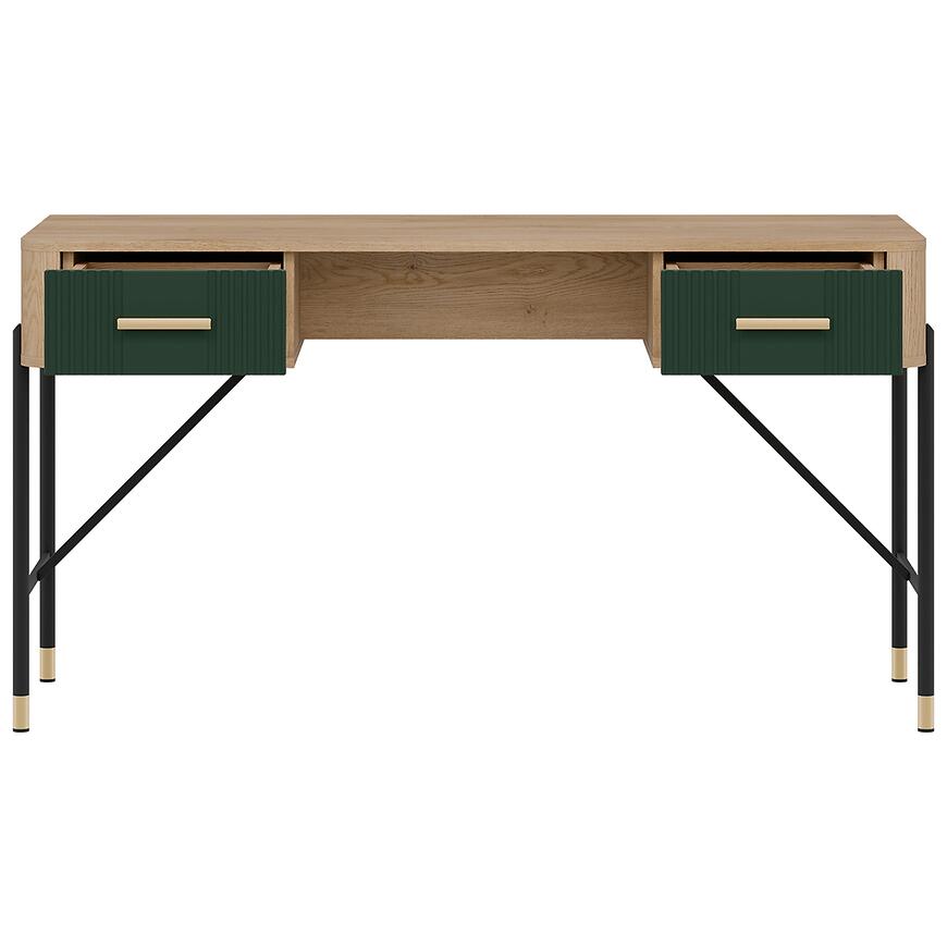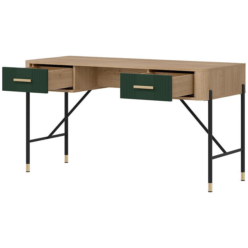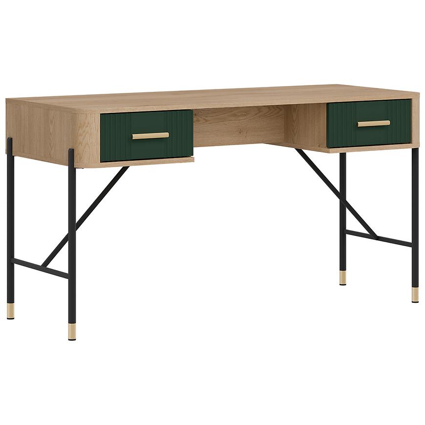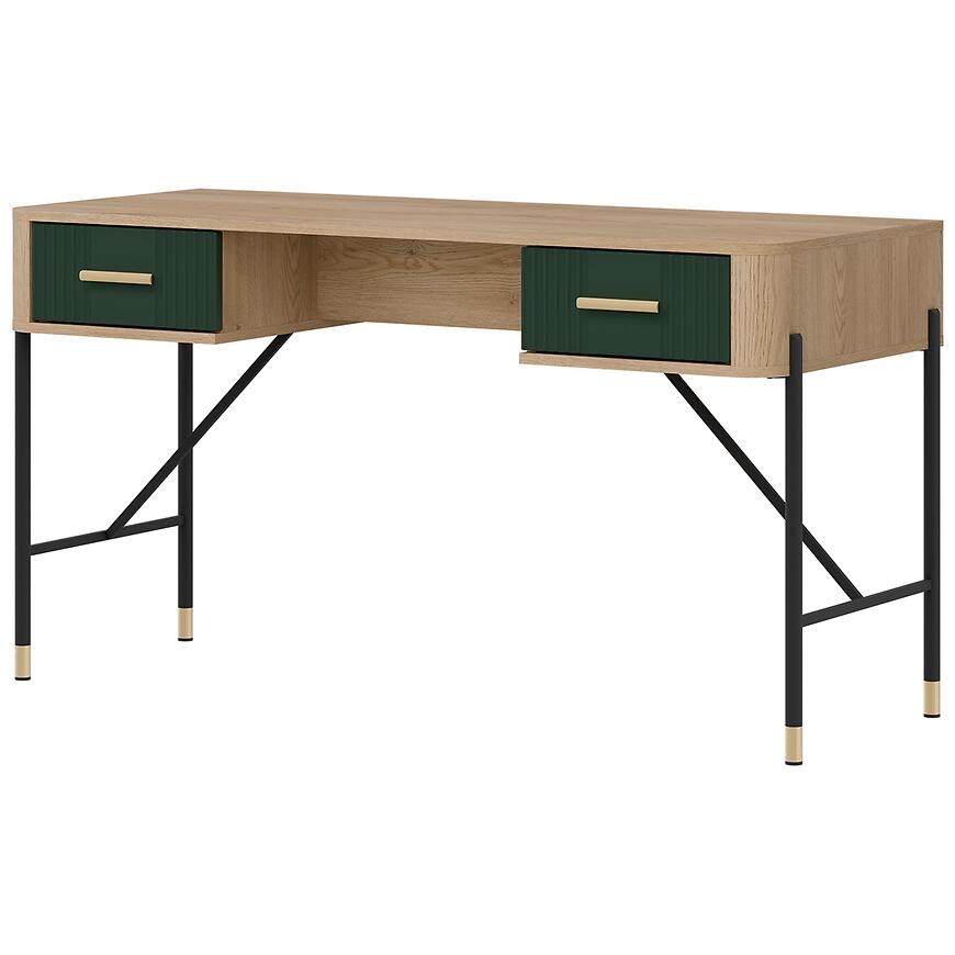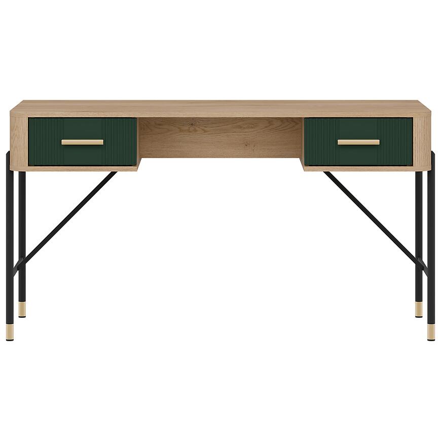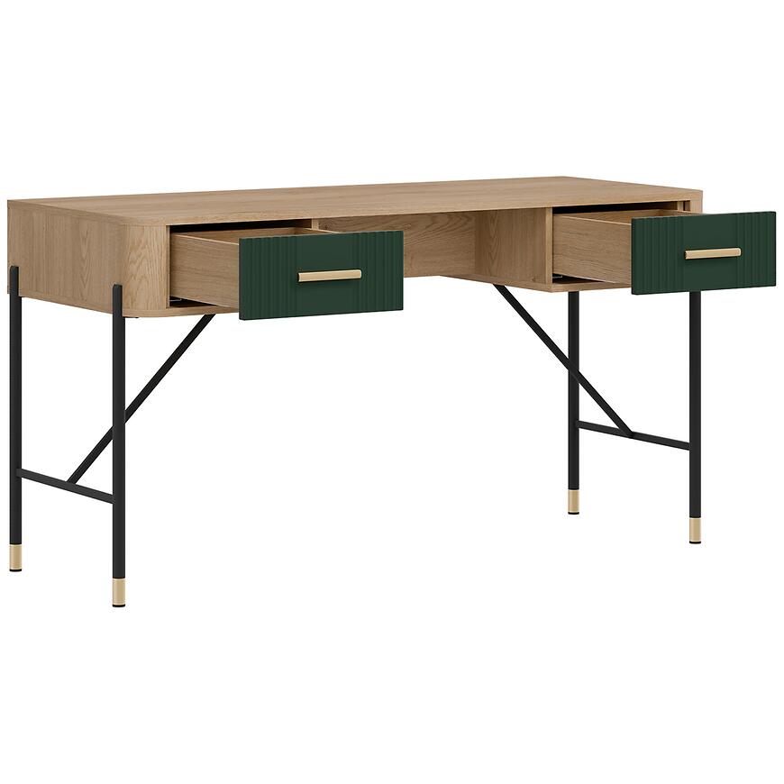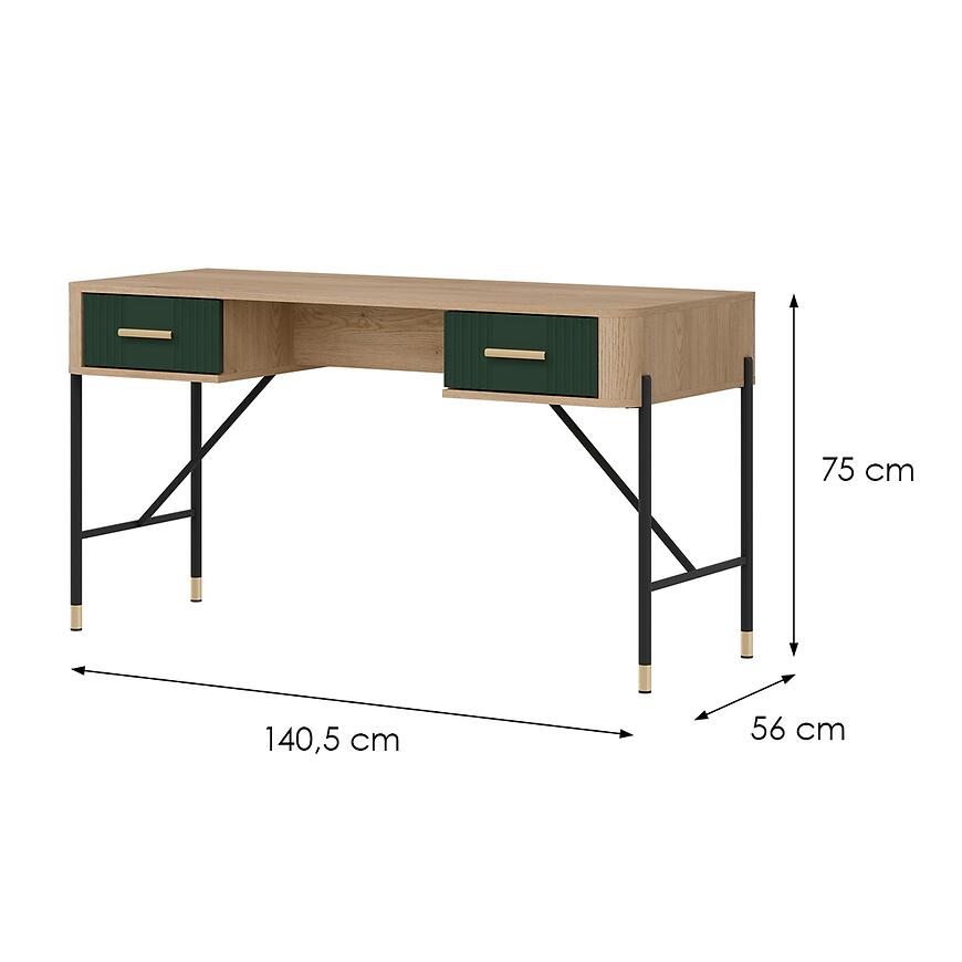 Korpus biurka wykonany jest z laminowanej płyty wiórowej w kolorze dąb Cremona, a fronty z płyty MDF w zielonym matowym wykończeniu. Takie połączenie materiałów gwarantuje trwałość, odporność na codzienne użytkowanie oraz łatwość utrzymania czystości. Dwie praktyczne szuflady umożliwiają przechowywanie dokumentów, przyborów biurowych czy akcesoriów, pomagając utrzymać porządek na blacie.