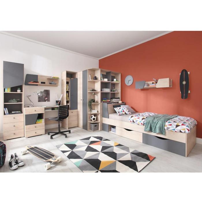 Półki ścienne wiszące to nie tylko praktyczne miejsce na ekspozycję ulubionych dekoracji, ale także element wzmacniający charakter pokoju młodzieżowego. Biurko z szufladami i półką pod klawiaturę to ergonomiczne miejsce do nauki i pracy, doskonale wpisujące się w estetykę kolekcji.