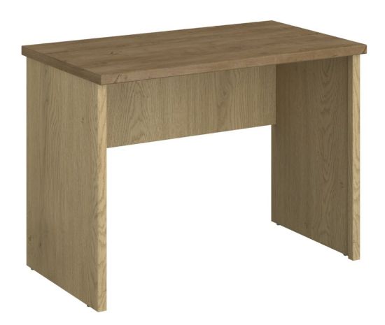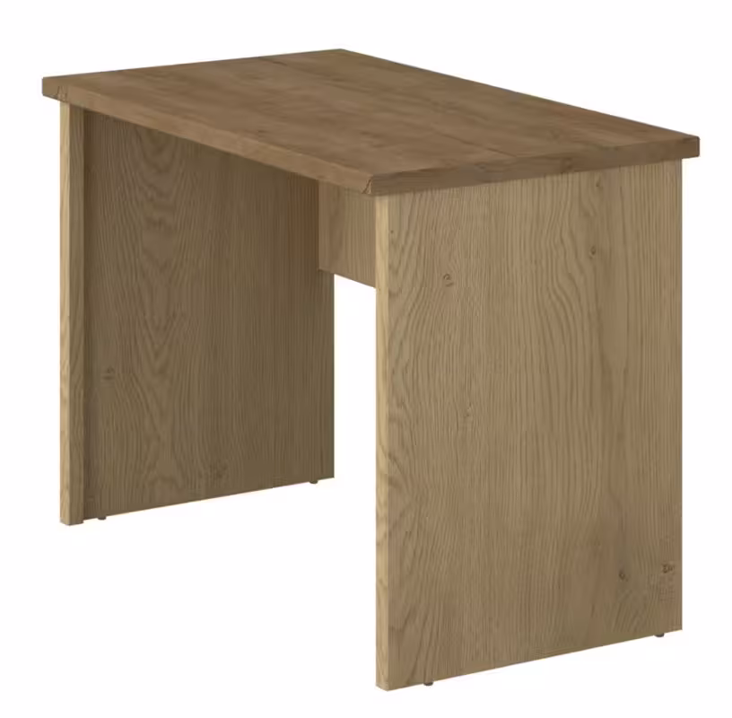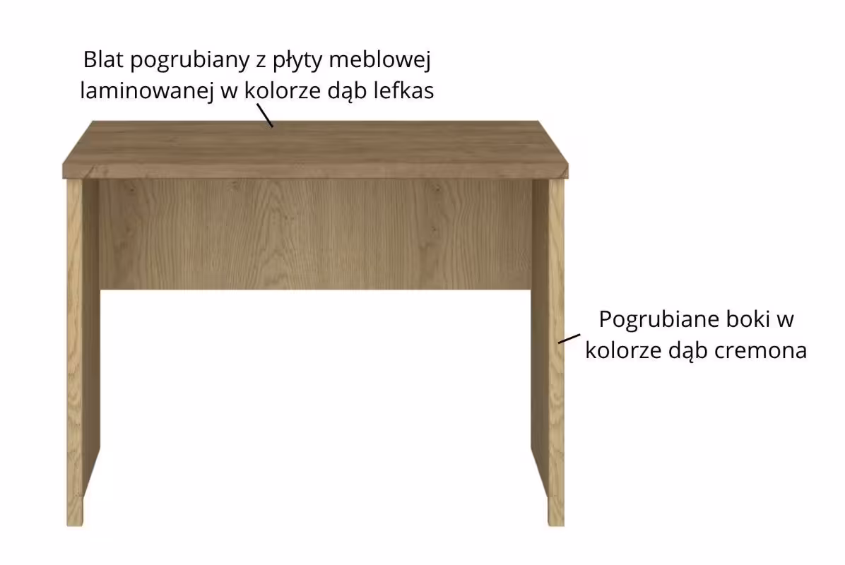 Blat wykonany z pogrubianej płyty meblowej laminowanej w dekorze dąb lefkas wyróżnia się wyraźnym rysunkiem drewna i zwiększoną odpornością na codzienne użytkowanie. To materiał, który dobrze znosi kontakt z wilgocią, temperaturą i drobnymi zarysowaniami, co ma znaczenie przy intensywnej pracy przy biurku.