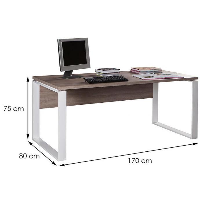 Meble zostały wykonane z płyty wiórowej laminowanej w kolorze ciemny dąb mat oraz metalu w kolorze białym. Dzięki swojej klasycznej kolorystyce, będą pasowały do każdego wnętrza. Nowoczesny styl mebli wpadnie do gustu każdemu, kto poszukuje eleganckiego, klasycznego umeblowania. Orientacja biurka: uniwersalna.