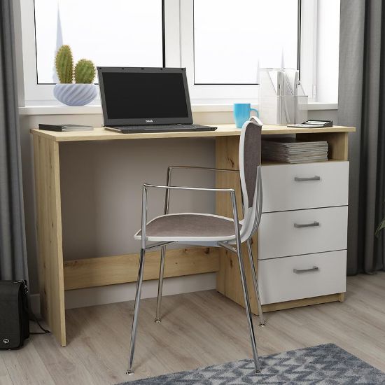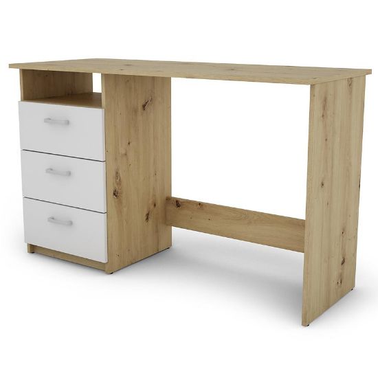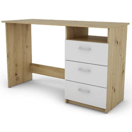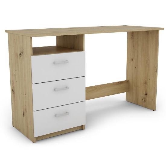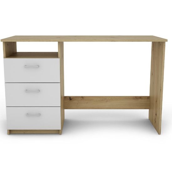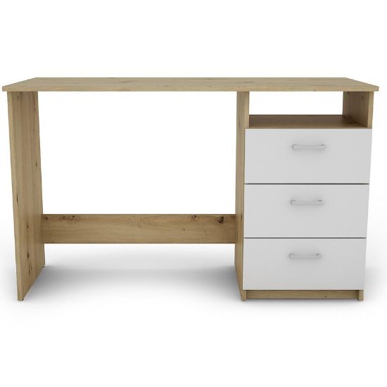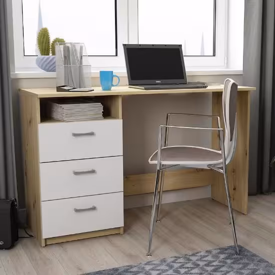 Biurko Ernesto w wybarwieniu artisan/biały to elegancki i funkcjonalny mebel, który doskonale sprawdzi się w nowoczesnych wnętrzach, zarówno w domowym biurze, gabinecie, jak i w pokoju młodzieżowym. Jego przemyślana konstrukcja oraz nowoczesny design zapewniają komfortową przestrzeń do pracy czy nauki, a przy tym świetnie komponują się z różnorodnymi aranżacjami wnętrz.