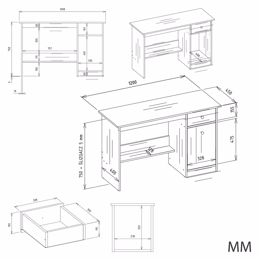 Model Estera 120 został wyposażony w przestronny blat roboczy, który bez problemu pomieści laptop, monitor oraz niezbędne akcesoria biurowe. Pojemna szafka z drzwiami to idealne miejsce na dokumenty, plecak lub większe przedmioty, natomiast wygodna szuflada na prowadnicach rolkowych umożliwia bezpieczne przechowywanie drobiazgów i przyborów. Ergonomiczny układ ułatwia organizację przestrzeni i sprzyja skupieniu podczas pracy.