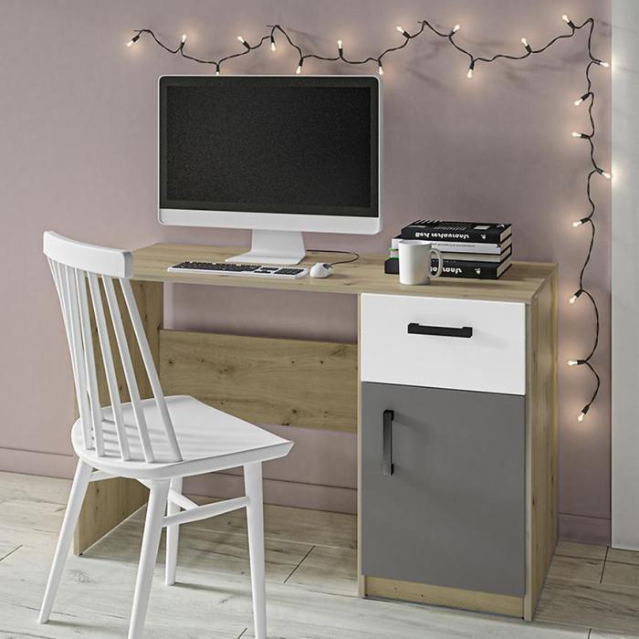 Biurko FINI to praktyczny i funkcjonalny mebel. Będzie stanowiło idealne uzupełnienie pokoju młodzieżowego lub dziecięcego, a ciekawe wybarwienie dodatkowo ożywi przestrzeń i nada nowoczesnego wyglądu.