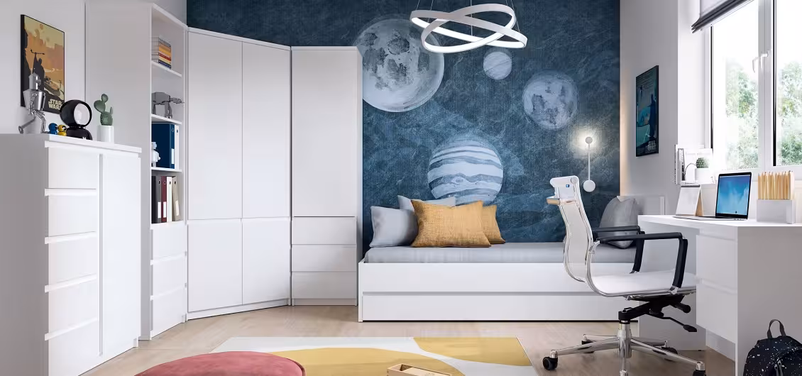 Minimalistyczna forma biurka Fribo w kolorze bieli alpejskiej doskonale wpisuje się w stylistykę nowoczesnych wnętrz. Uniwersalny design pozwala z łatwością dopasować je do pozostałych mebli z kolekcji Fribo, tworząc spójną, harmonijną aranżację. Brak uchwytów i czyste linie frontów podkreślają nowoczesny charakter bryły, wnosząc do pomieszczenia świeżość i wizualny ład.